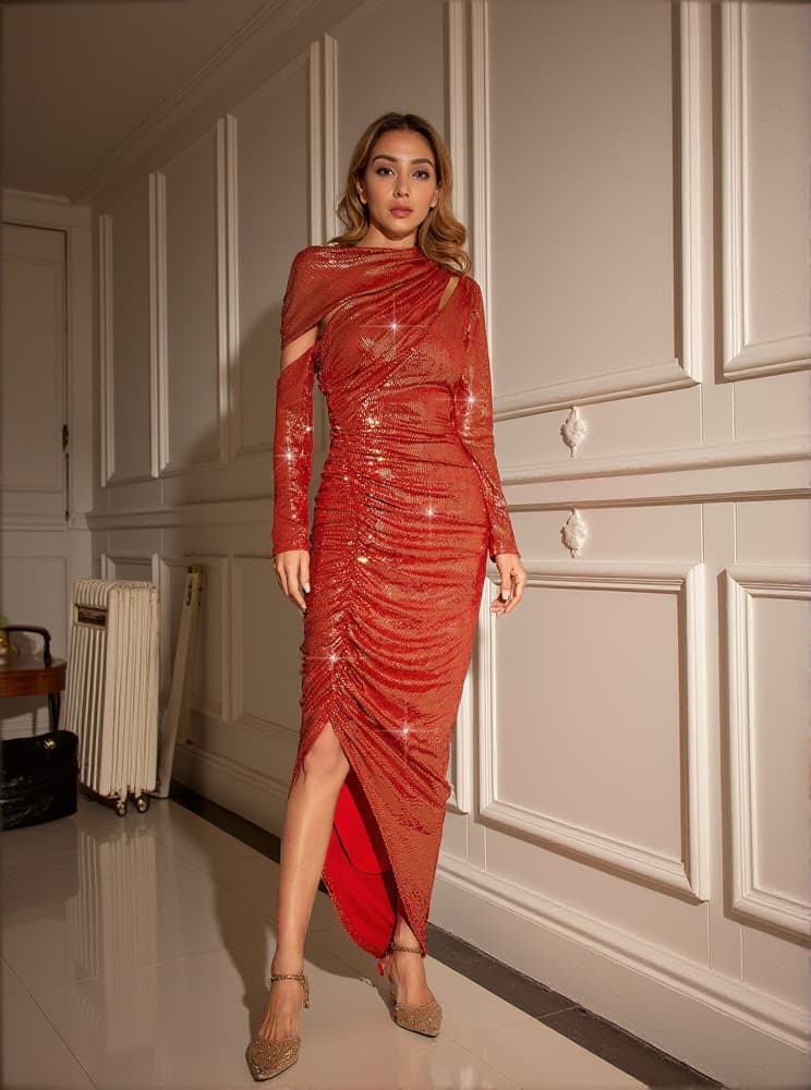 Crafted with luxurious sequin fabric, the Tiago Cutout Ruched Sequin Dress is a must-have for any special occasion. Featuring intricate cutouts and ruching, this dress offers a figure-flattering silhouette. Perfect for parties or weddings, this dress exudes elegance and sophistication.