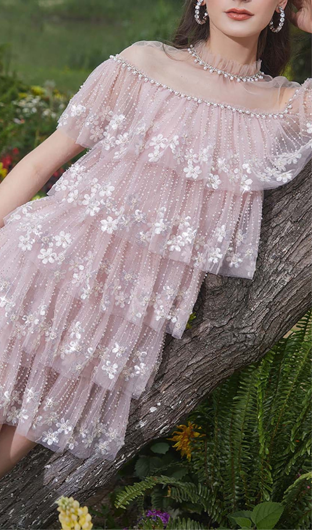 Utterly feminine and flirty, this pink mini dress delights with its delicate lace trim and breezy tiered silhouette. The slim bodice highlights your shape before giving way to the romantic cascading tiers. Look perfectly polished at garden parties, bridal showers and daytime weddings.