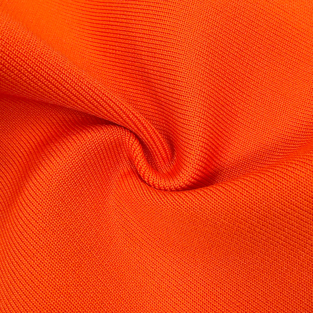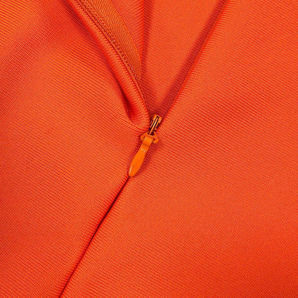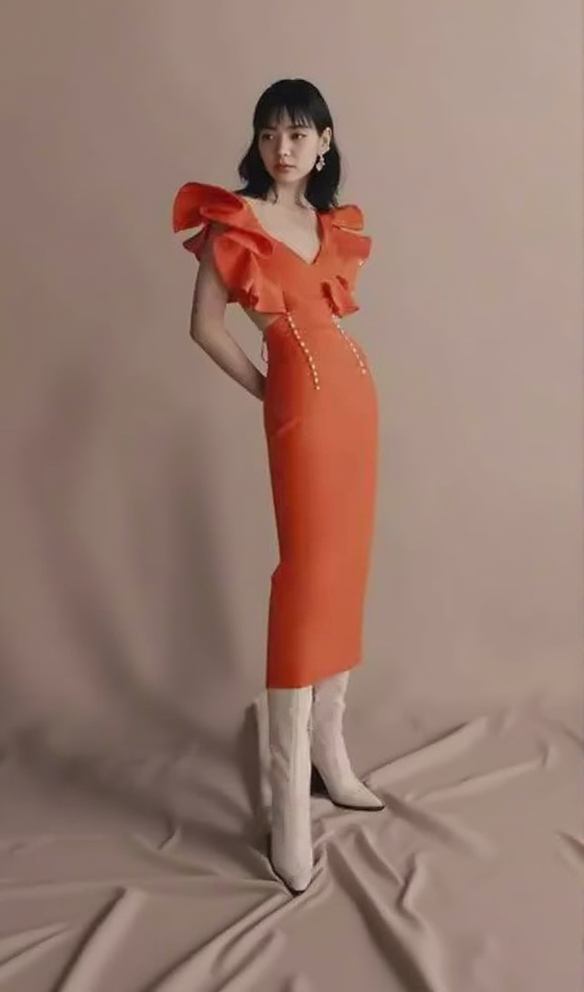 TOBEY ORANGE PEARL EMBELLISHED RUFFLE TRIM NECK MIDI DRESS