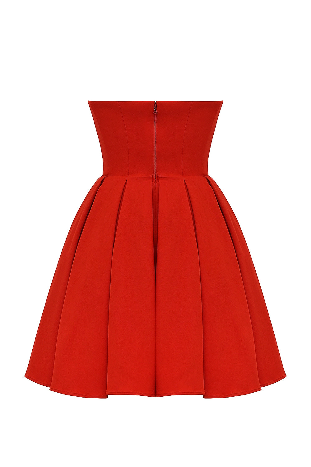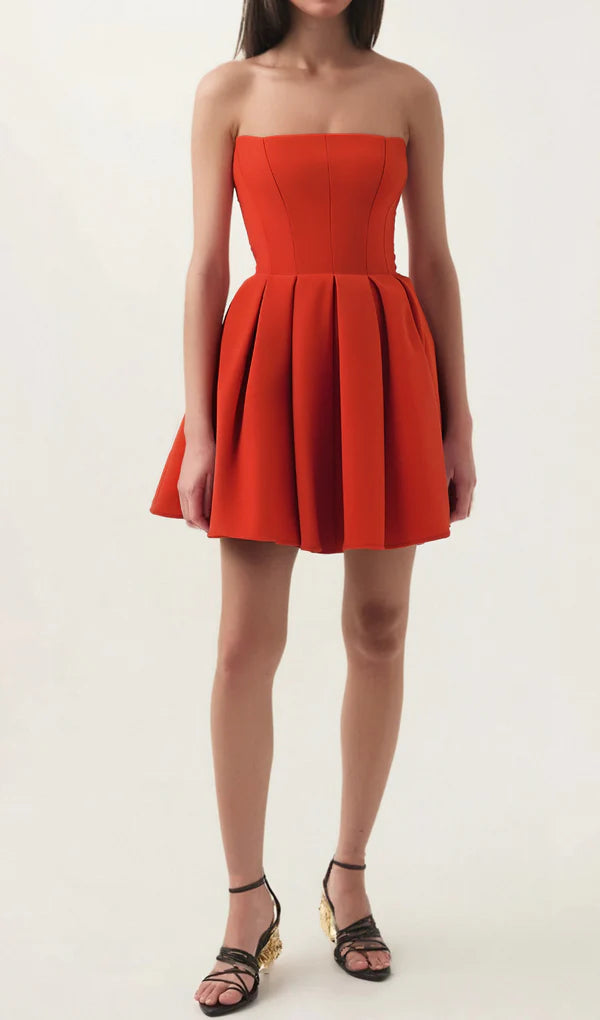 tomato red strapless pleated mini dress