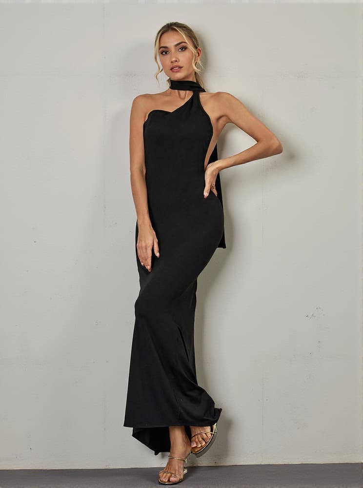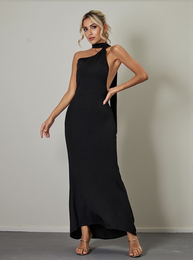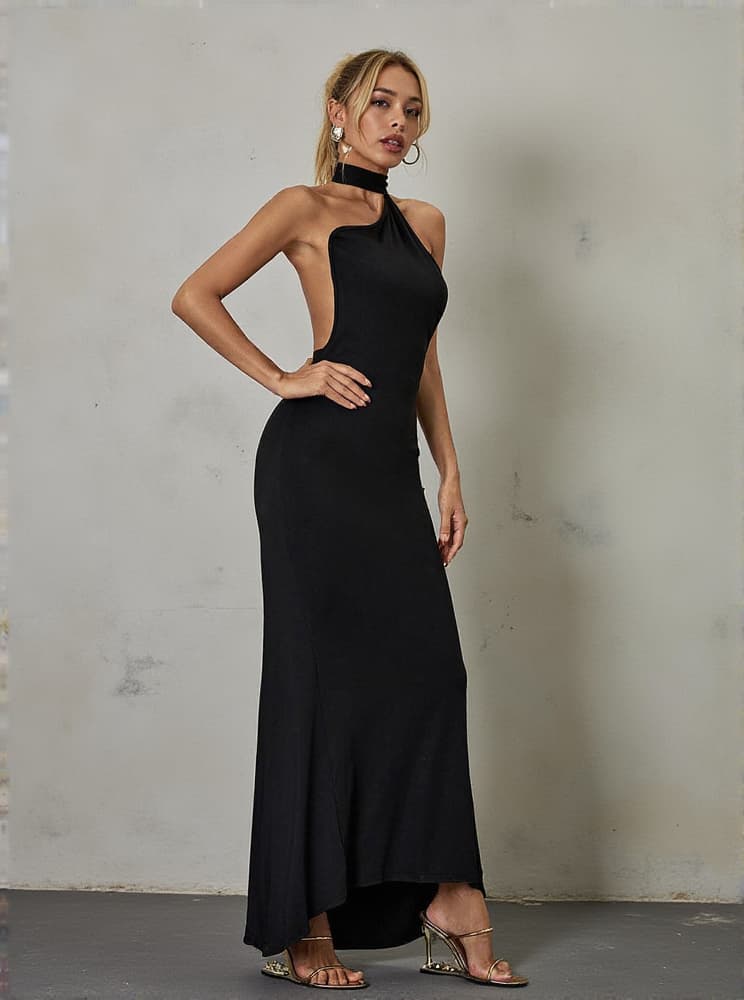 Toula Backless Maxi Dress In Black offers the perfect combination of coverage and elegance. The floor-skimming silhouette features a backless design with a ruched detail that creates an alluring yet modest look. The lightweight fabric will keep you feeling cool and comfortable throughout the day.