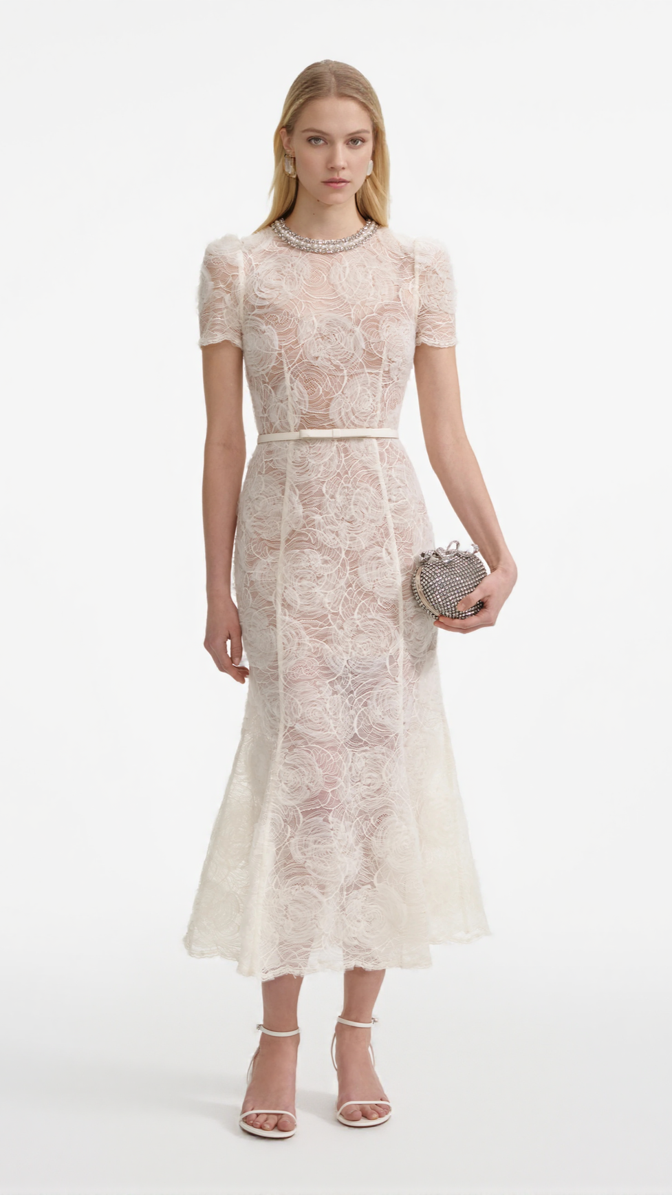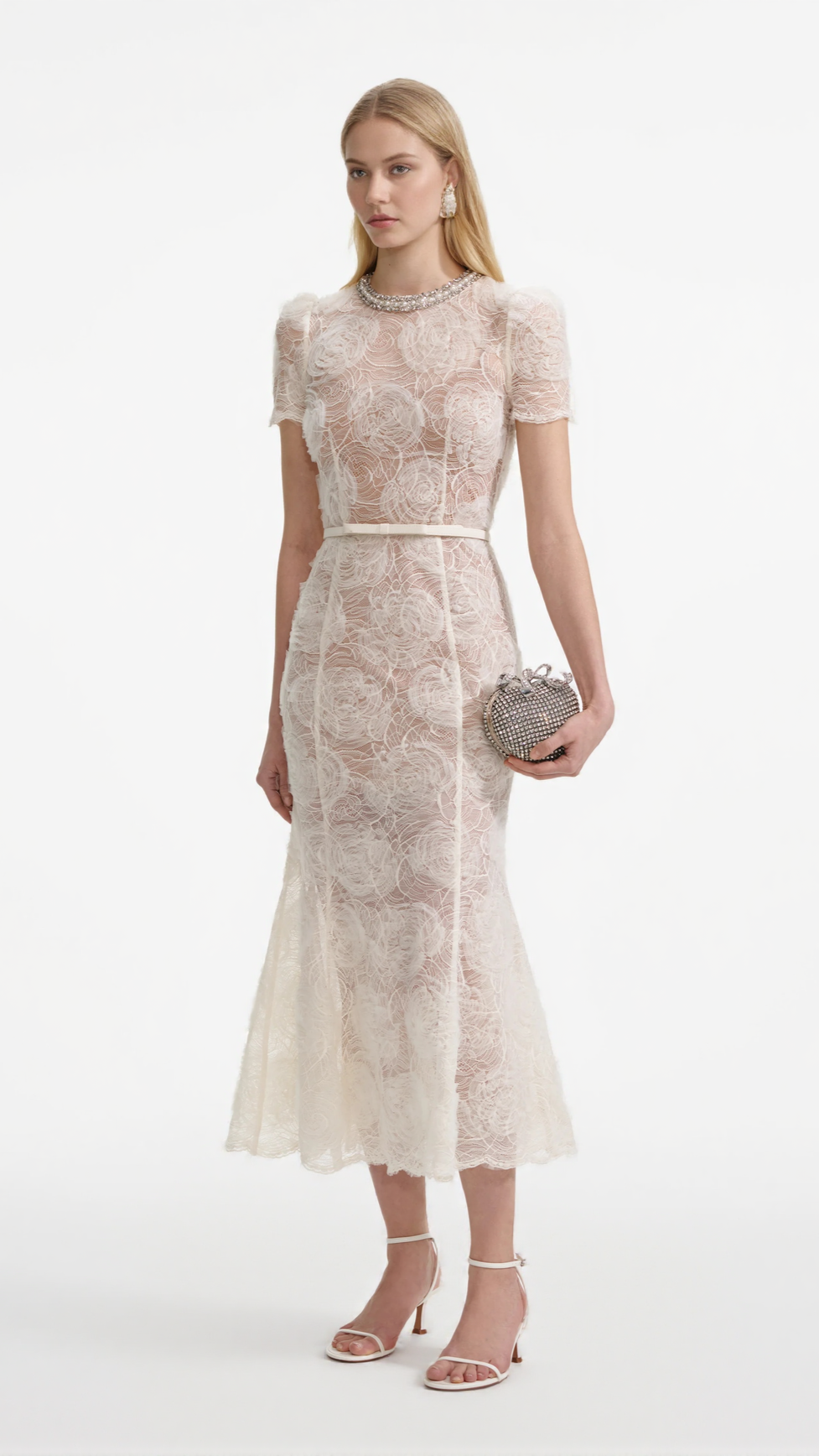 TULLE LACE DIAMANTE MIDI DRESS IN BEIGE