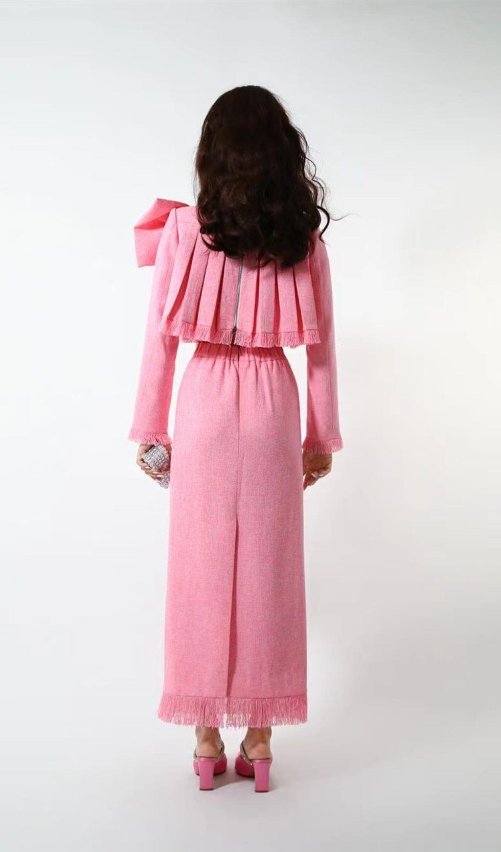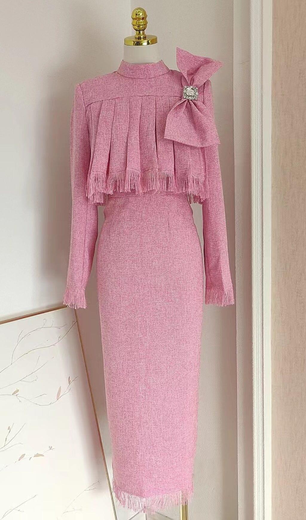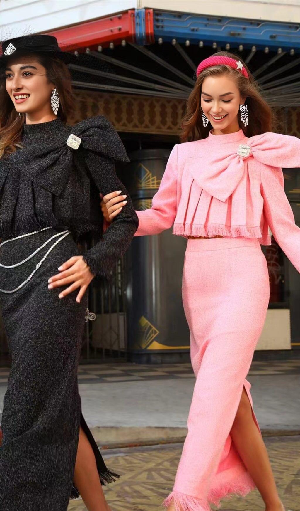 Experience timeless luxury with the pink tweed bow embellished set. Crafted from exquisite, soft fabric, this elegant set is designed with a high neckline top and oversized bow detail for added sophistication. The coordinating pencil skirt features a fringed hem for a modern finish. Perfect for any special occasion, this exquisite set is sure to make a statement.