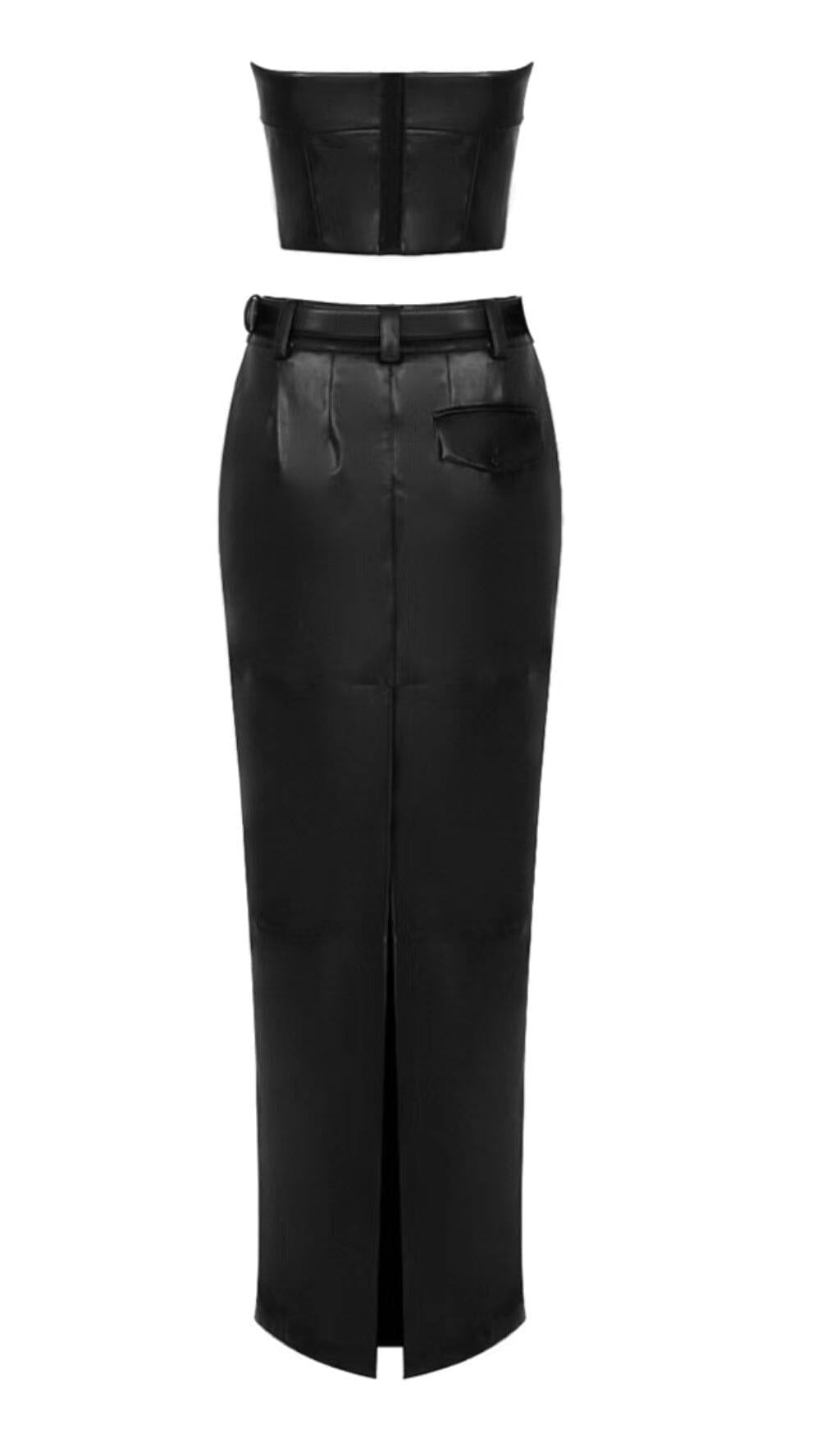 Introducing the Two-Piece Matte Leather Top with Belt Dress in Black