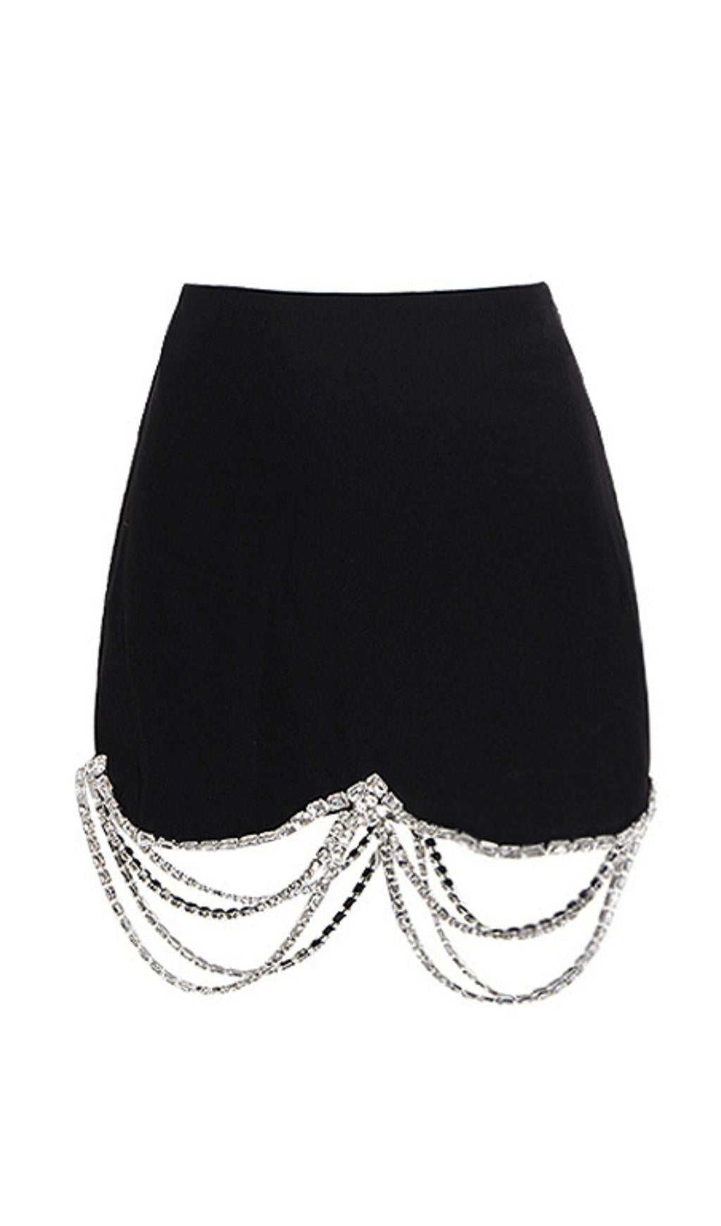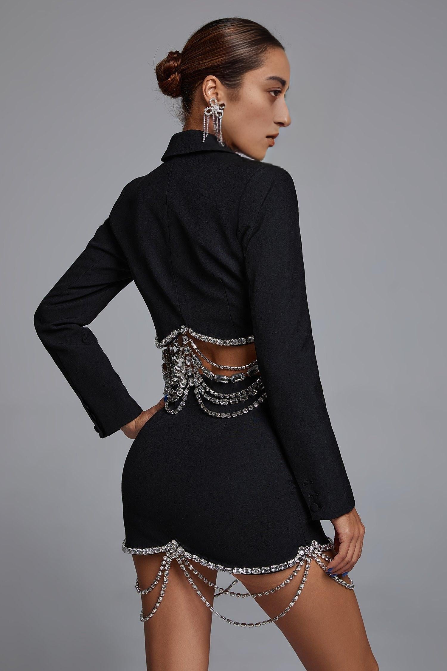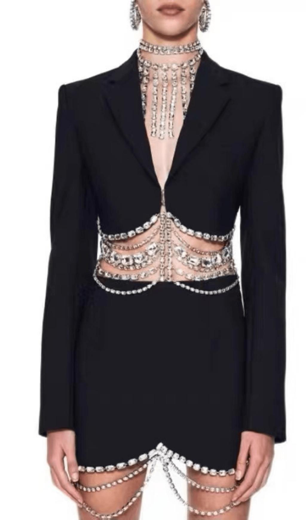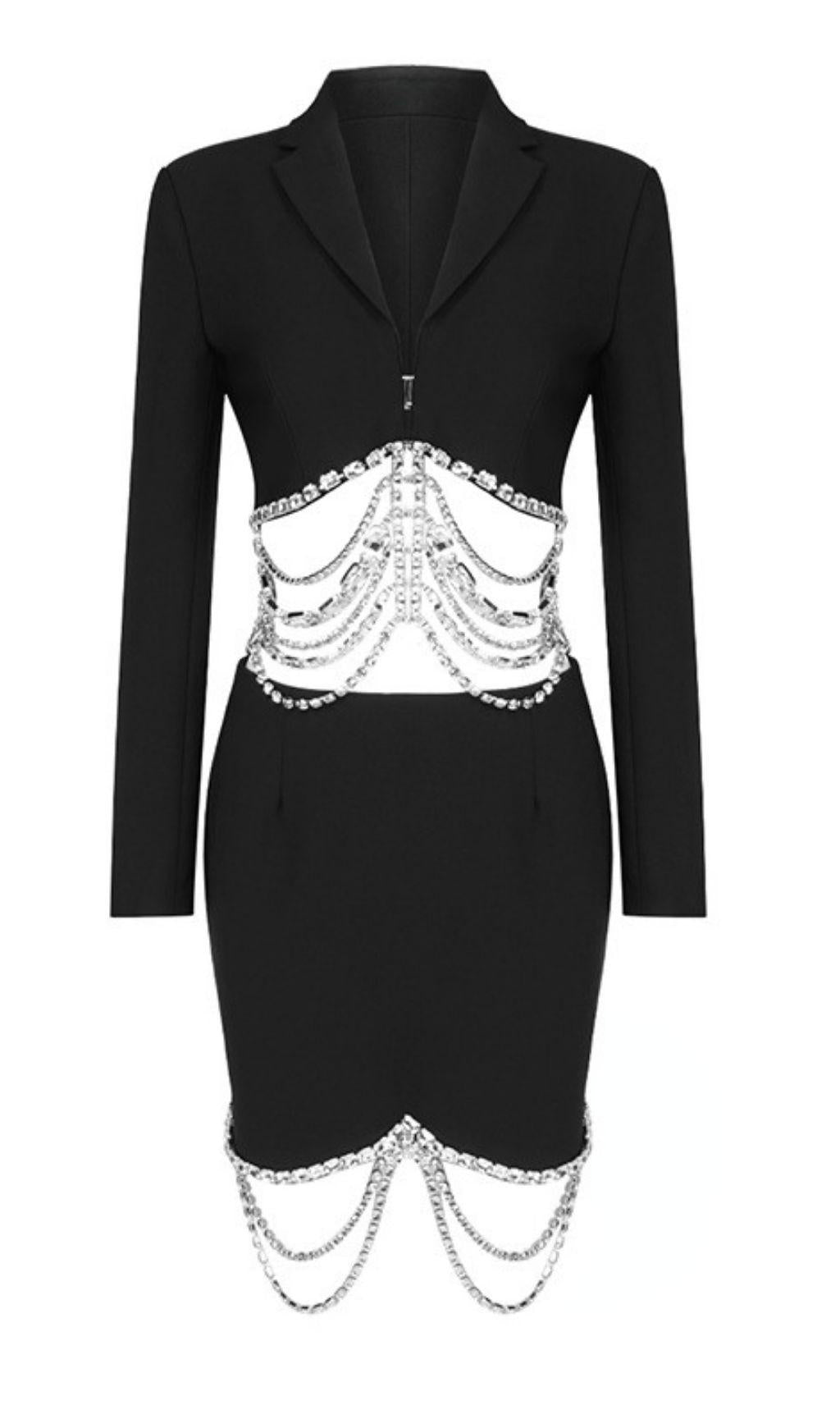 Two-piece suit with rhinestone chain