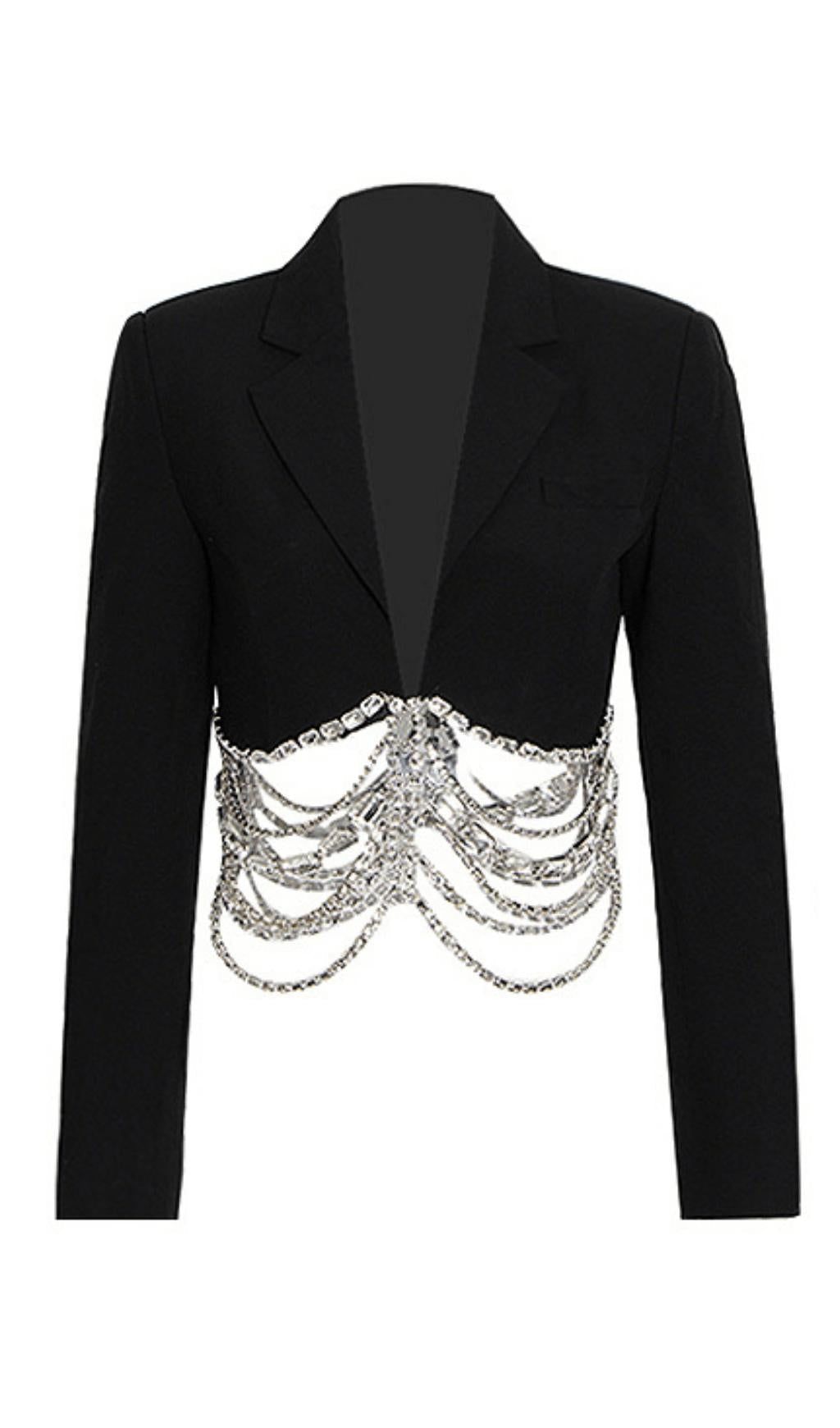 Elevate your style with this stunning two-piece suit featuring a rhinestone chain. Perfect for special occasions, this suit will make you the center of attention wherever you go. With its unique design and high-quality materials, it is sure to impress.