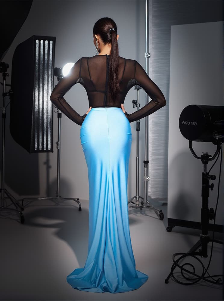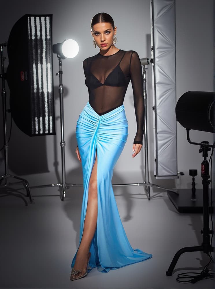 Look your best in the Tyndall Ruched Split Satin Skirt Set In Sky. Featuring a long sleeve black mesh top and a ruched front high split satin skirt in sky, this ensemble will make a statement while keeping you comfortable. The slim fit and luxurious fabric make this set perfect for a special event or night out.