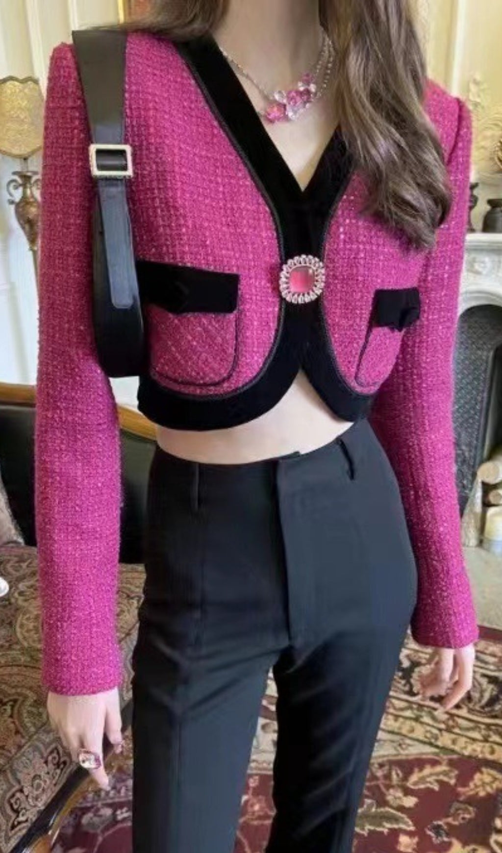 V NECK LONG SLEEVE PATCHWORK BUTTON VINTAGE SHORT COAT
