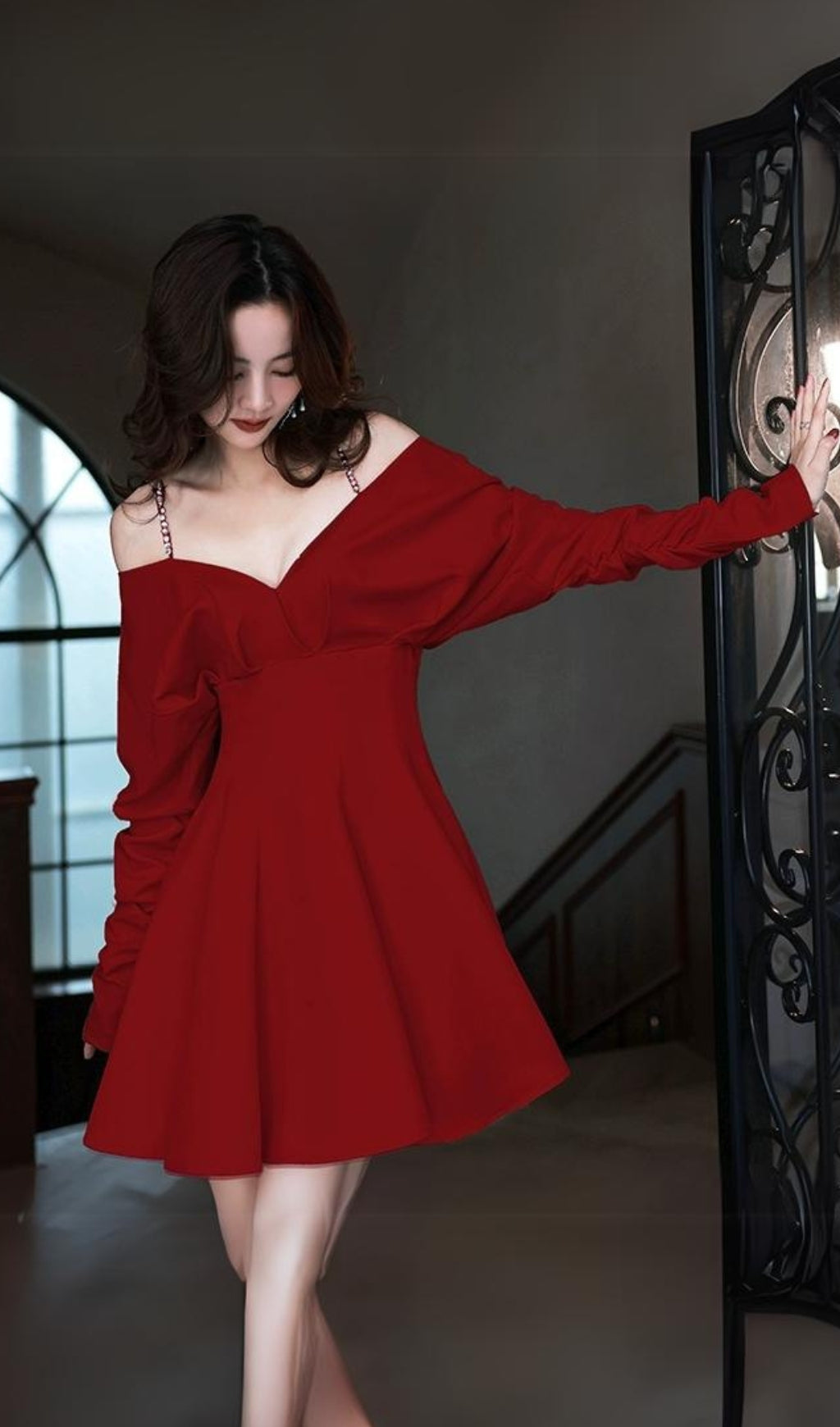 V-NECK LONG-SLEEVED A-LINE SUSPENDER DRESS