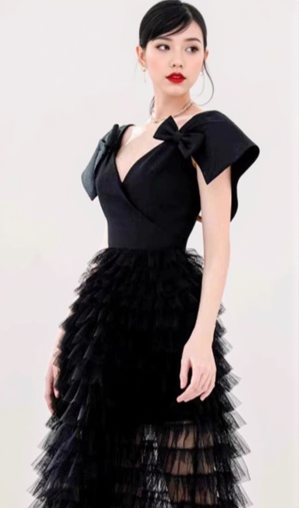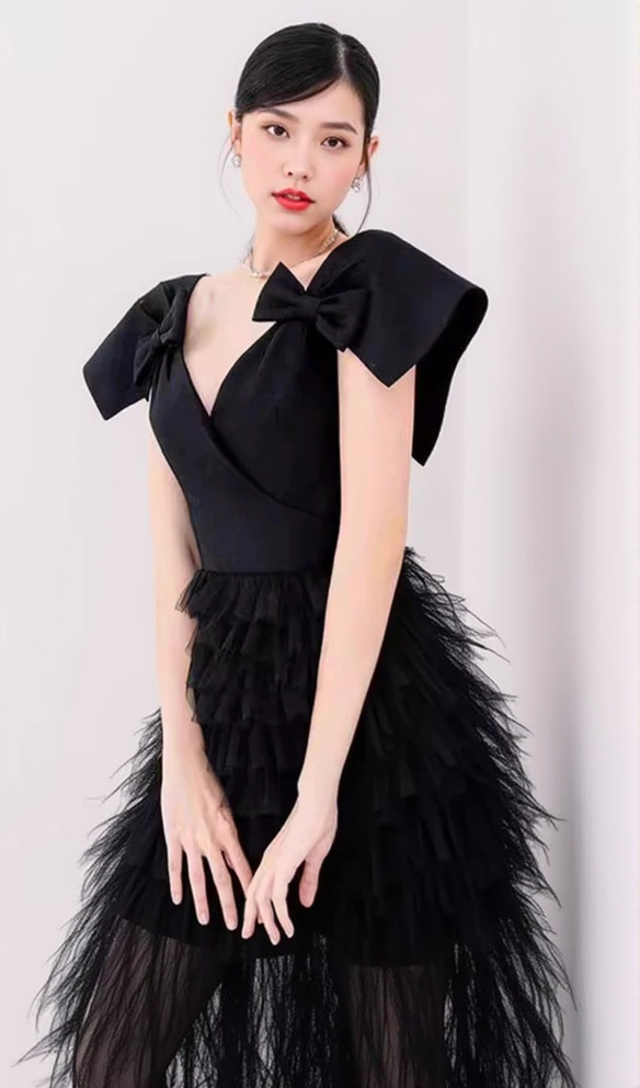 The unique design combines trendy mesh and ruffles with a charming bowknot detail. This dress is sure to turn heads and make you feel confident and stylish. Upgrade your wardrobe today!