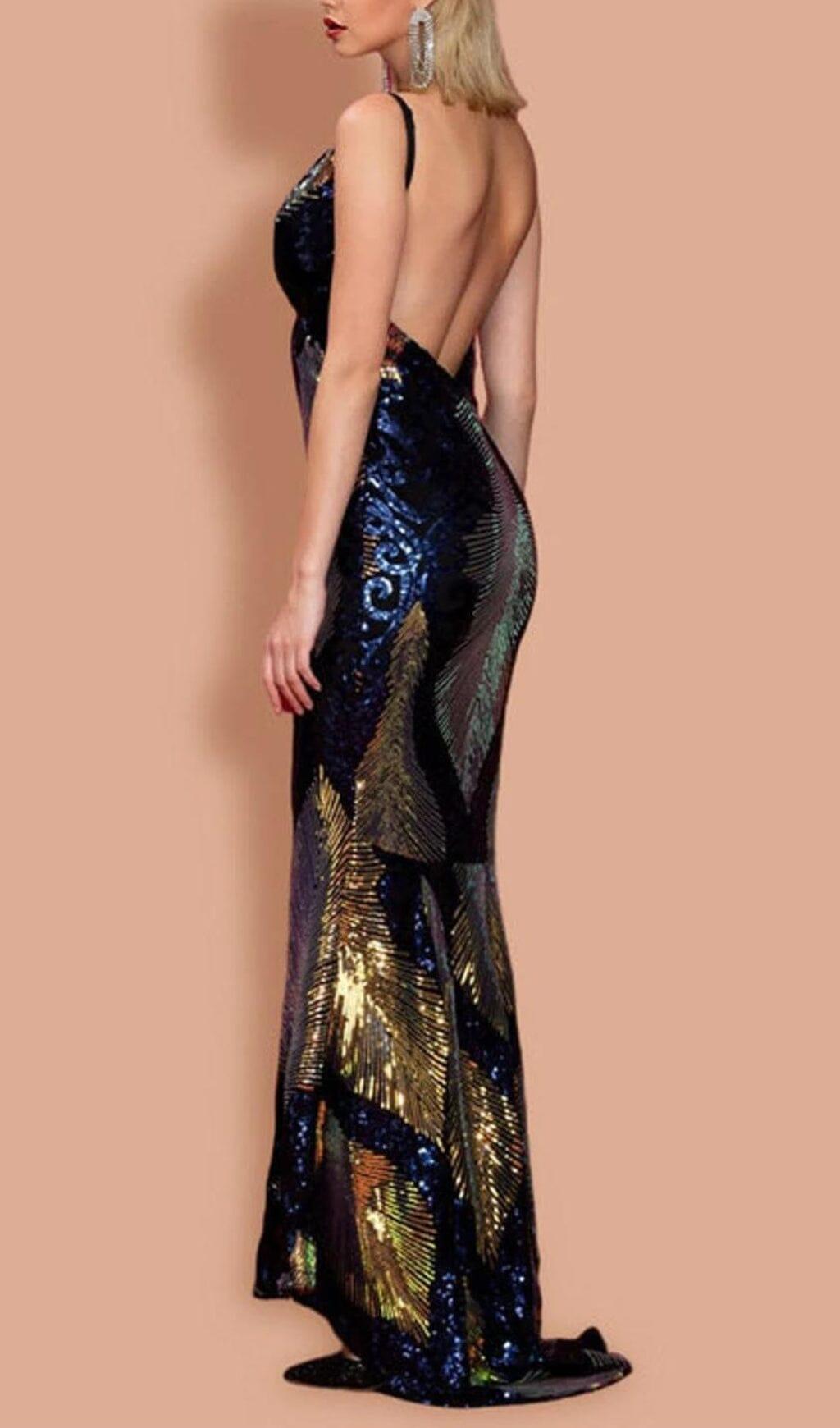 V-NECK SEQUINED BACKLESS DRESS IN DARK BLUE