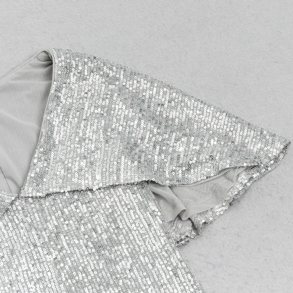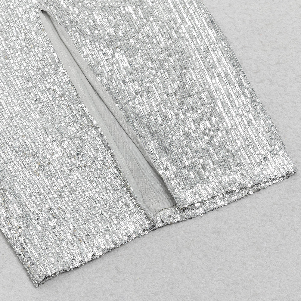 V-NECK SILVER SEQUIN SLIT BODYCON DRESS