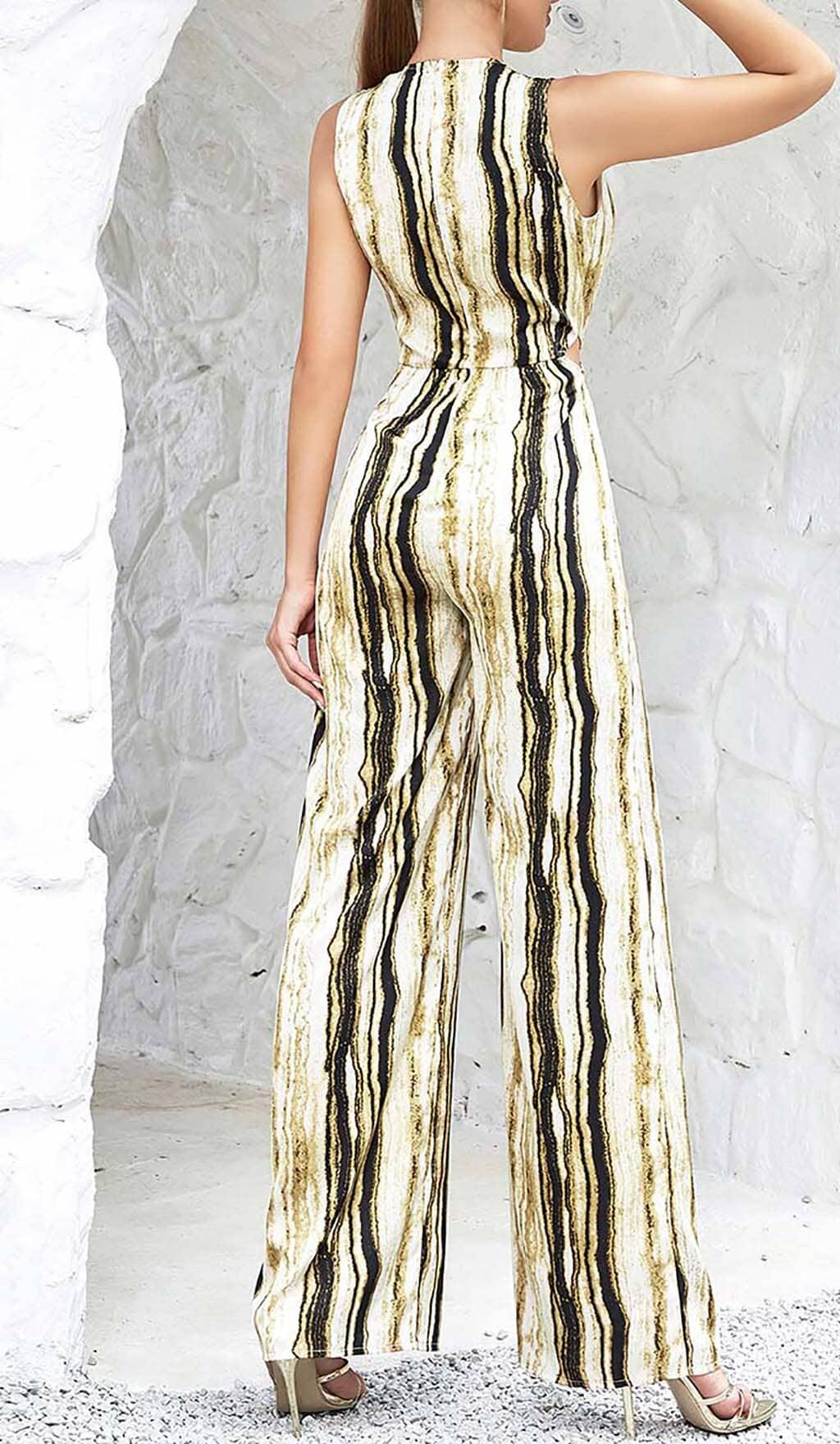 Elevate your style game with our V-Neck Sleeveless Stripe Jumpsuit. Embrace effortless elegance and make a fashion statement wherever you go. Order now and experience the perfect combination of comfort, style, and versatility.