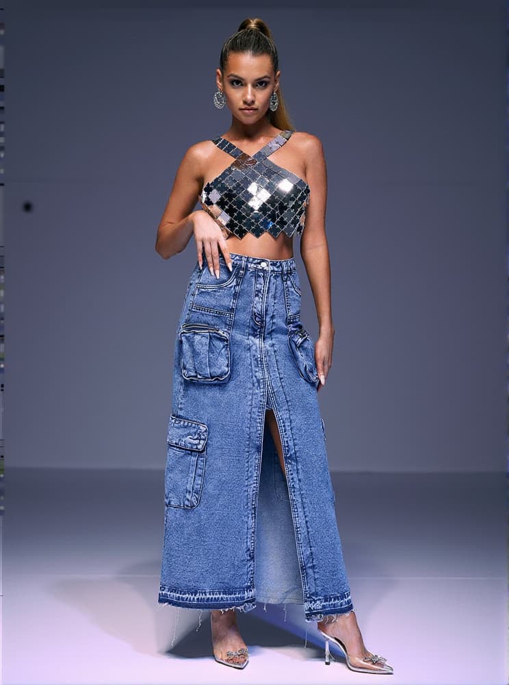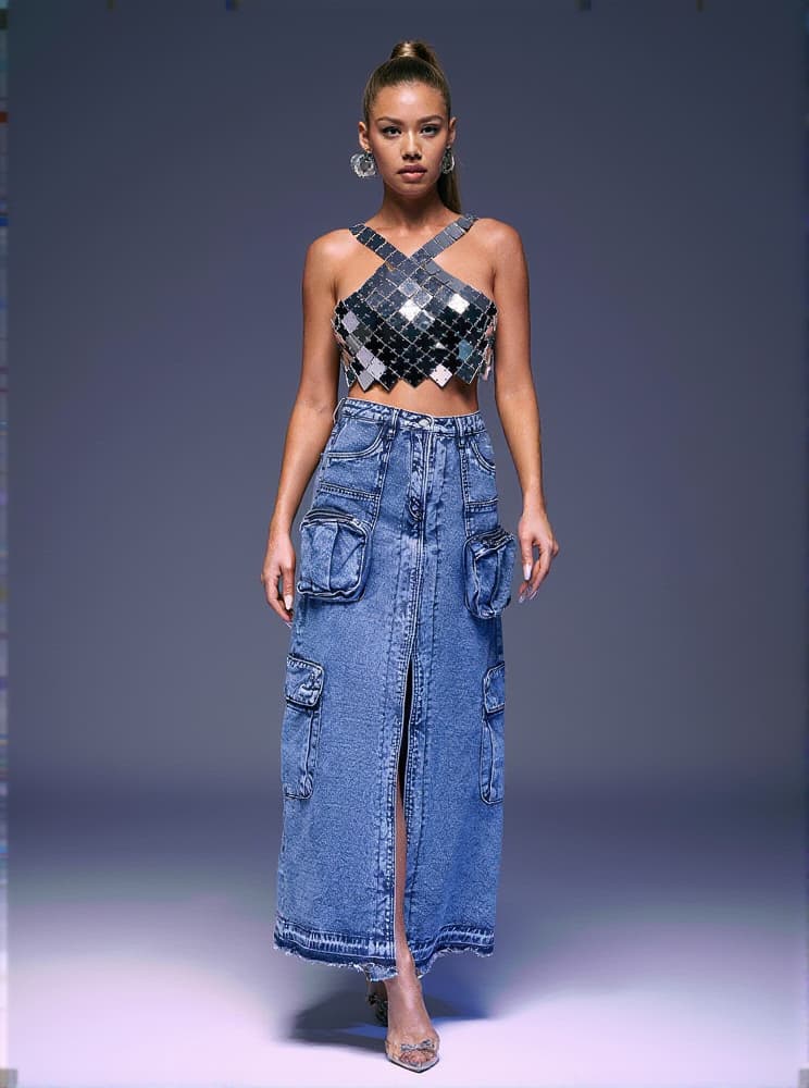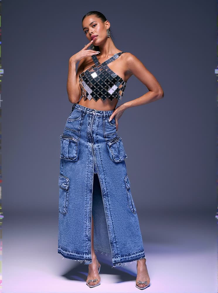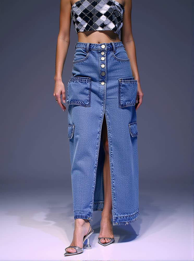 Valencia Pocket Split Denim Skirt In Blue