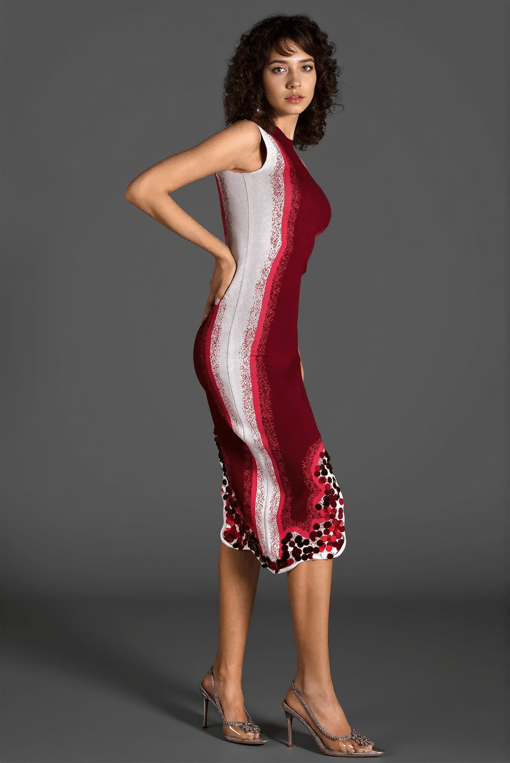 The model is showcasing the Valora Gradient Wave Sequin Dress in size M.