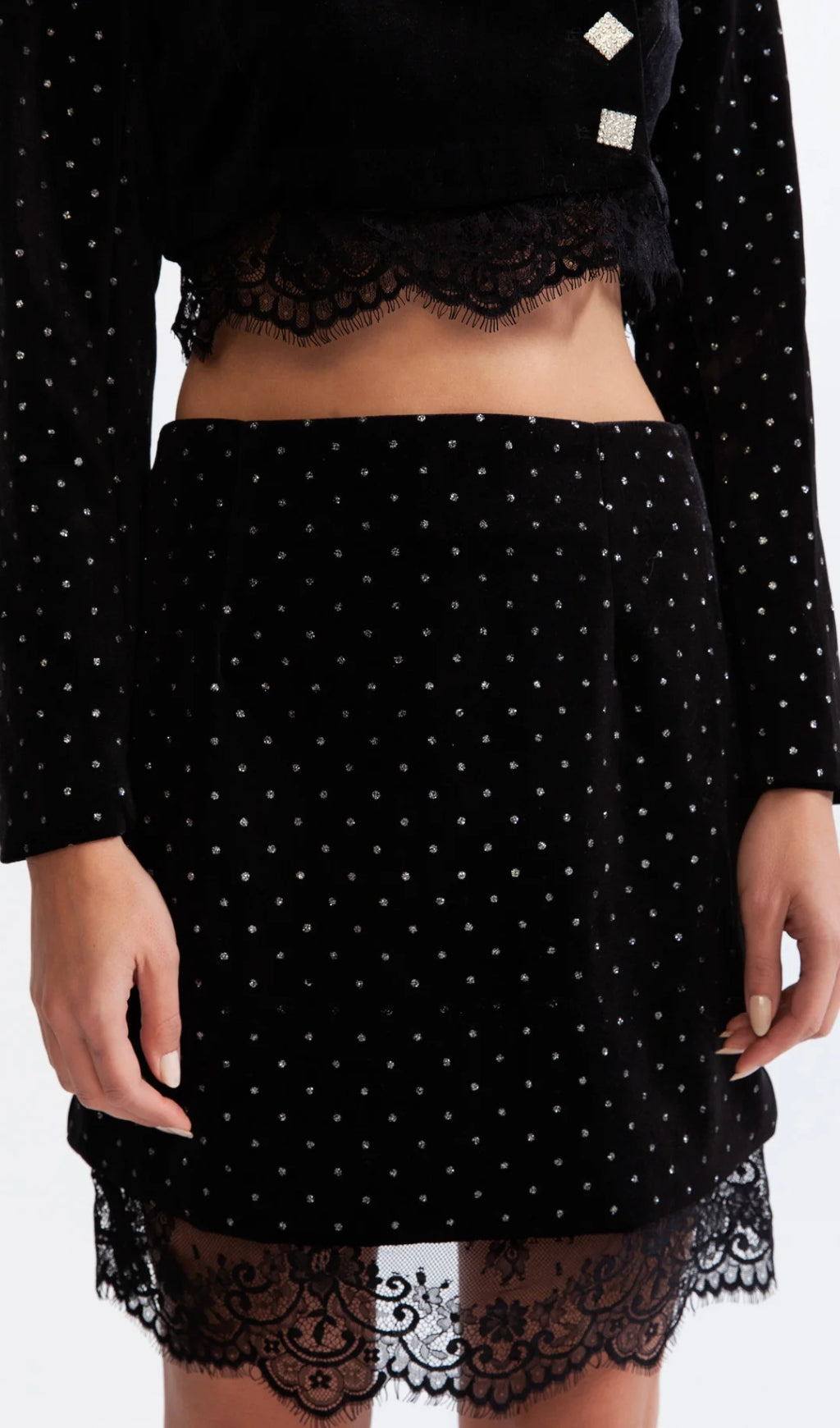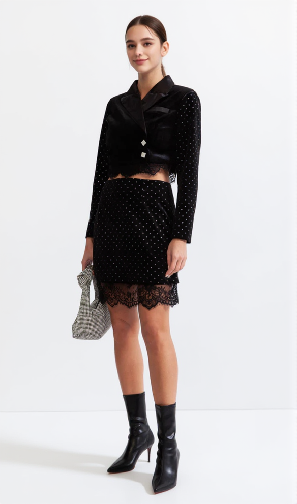 This sleek velvet co-ord set is crafted from luxurious velvet with a sophisticated dots print, the blazer features diamond buttons and long sleeves, while the high waisted skirt is completed with a lateral zip closure.