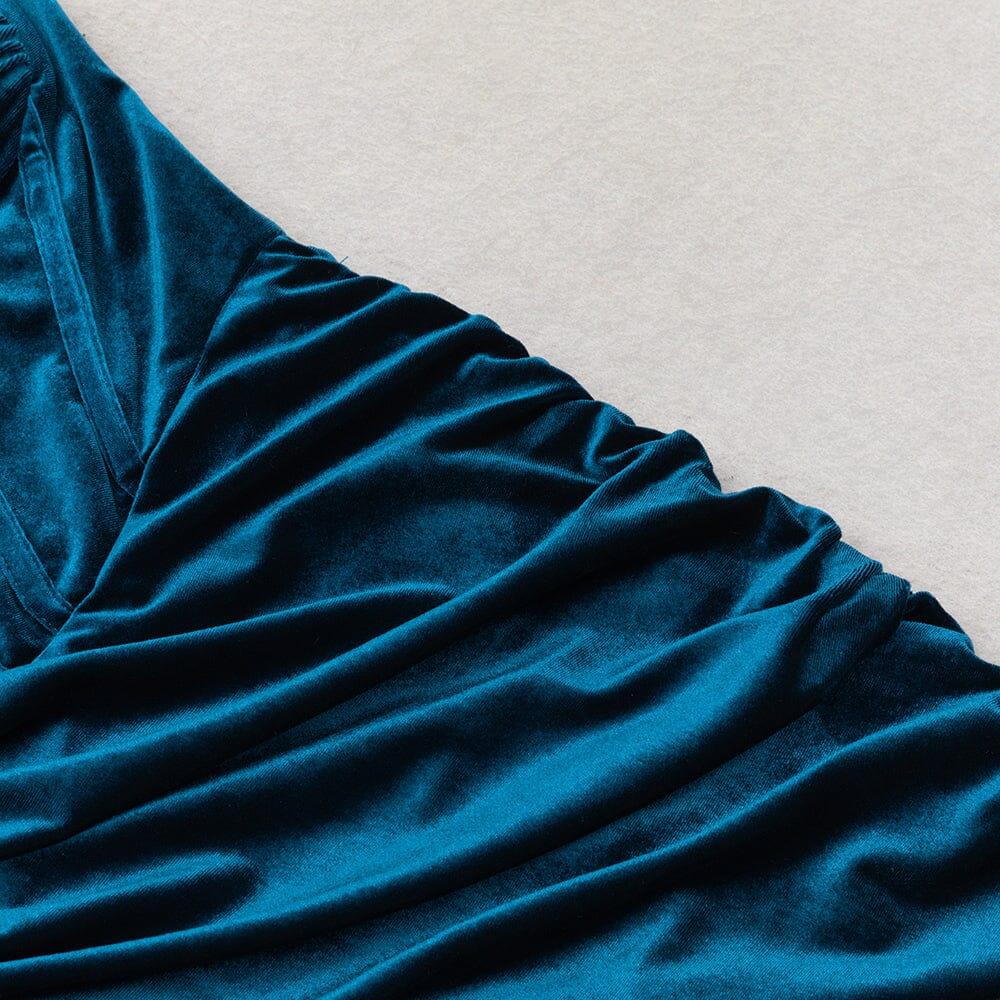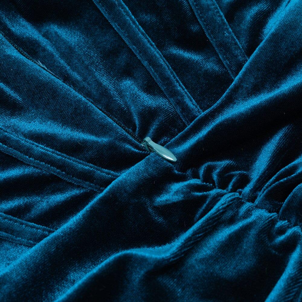 Our dress features a luxurious velvet fabric in a beautiful shade of blue. This adds a touch of sophistication to any outfit, making you the center of attention wherever you go.
