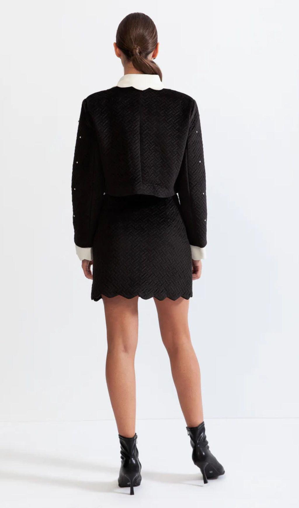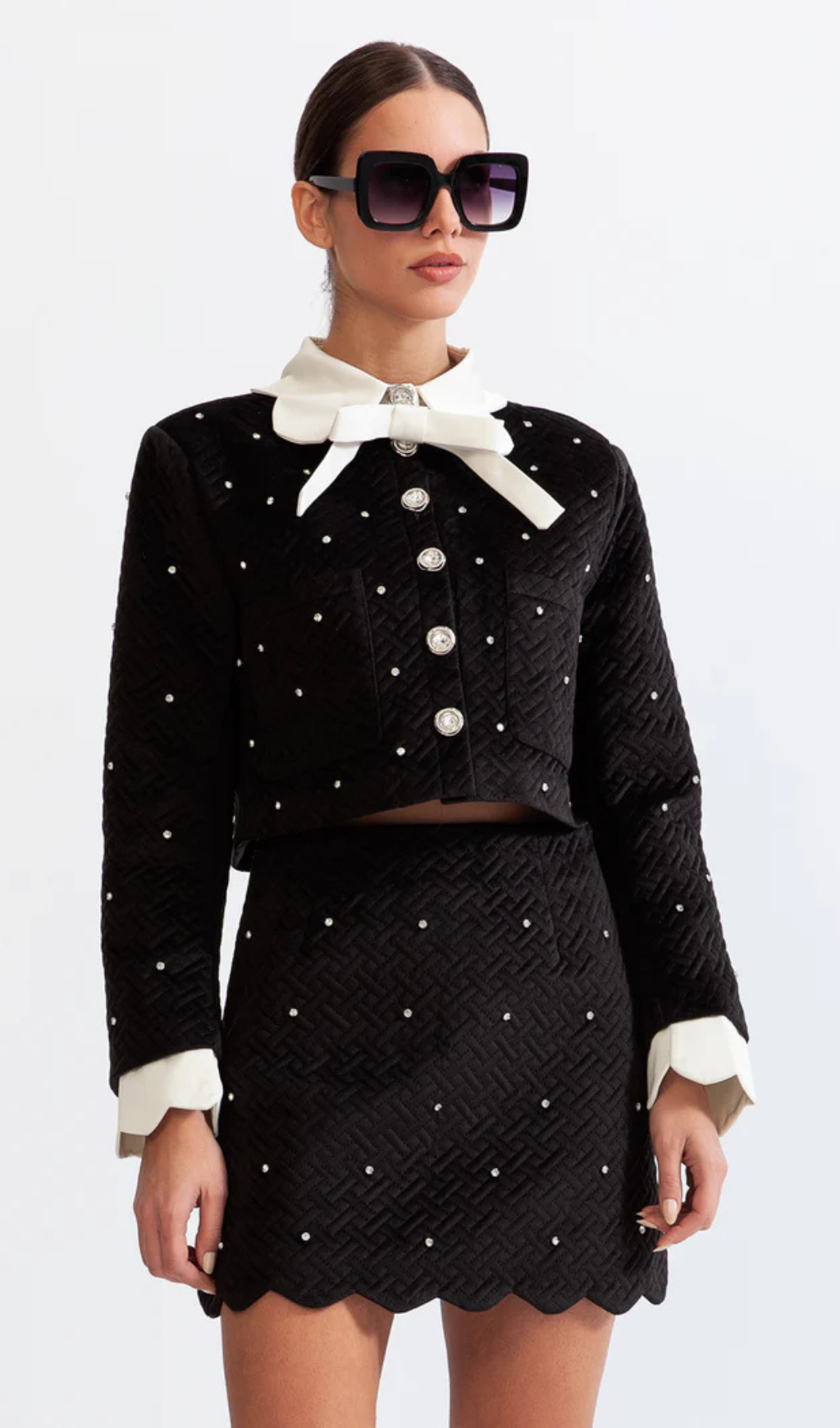 The Velvet Jewel co-ord is a sophisticated and stylish ensemble featuring luxurious velvet fabric with silver buttons and a detachable white satin bow. The blazer showcases a white collar and cuffs and a single breasted closure. The high-waisted skirt is designed for a flattering, tailored fit.