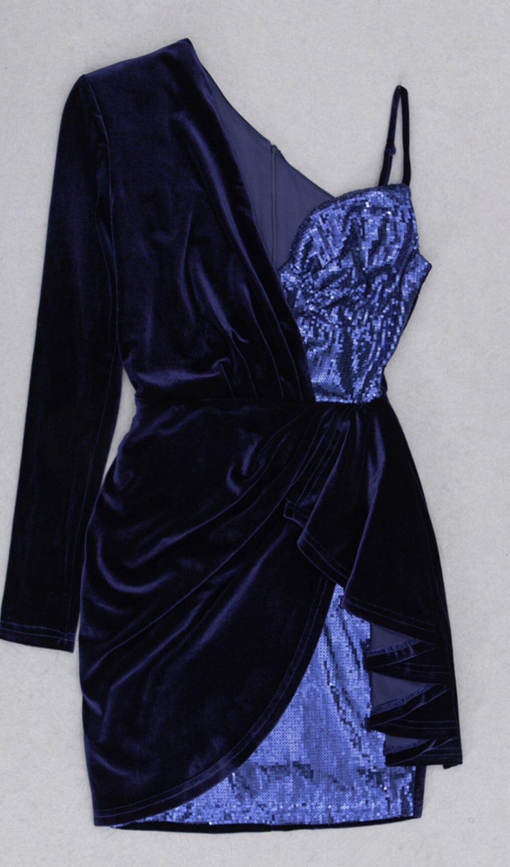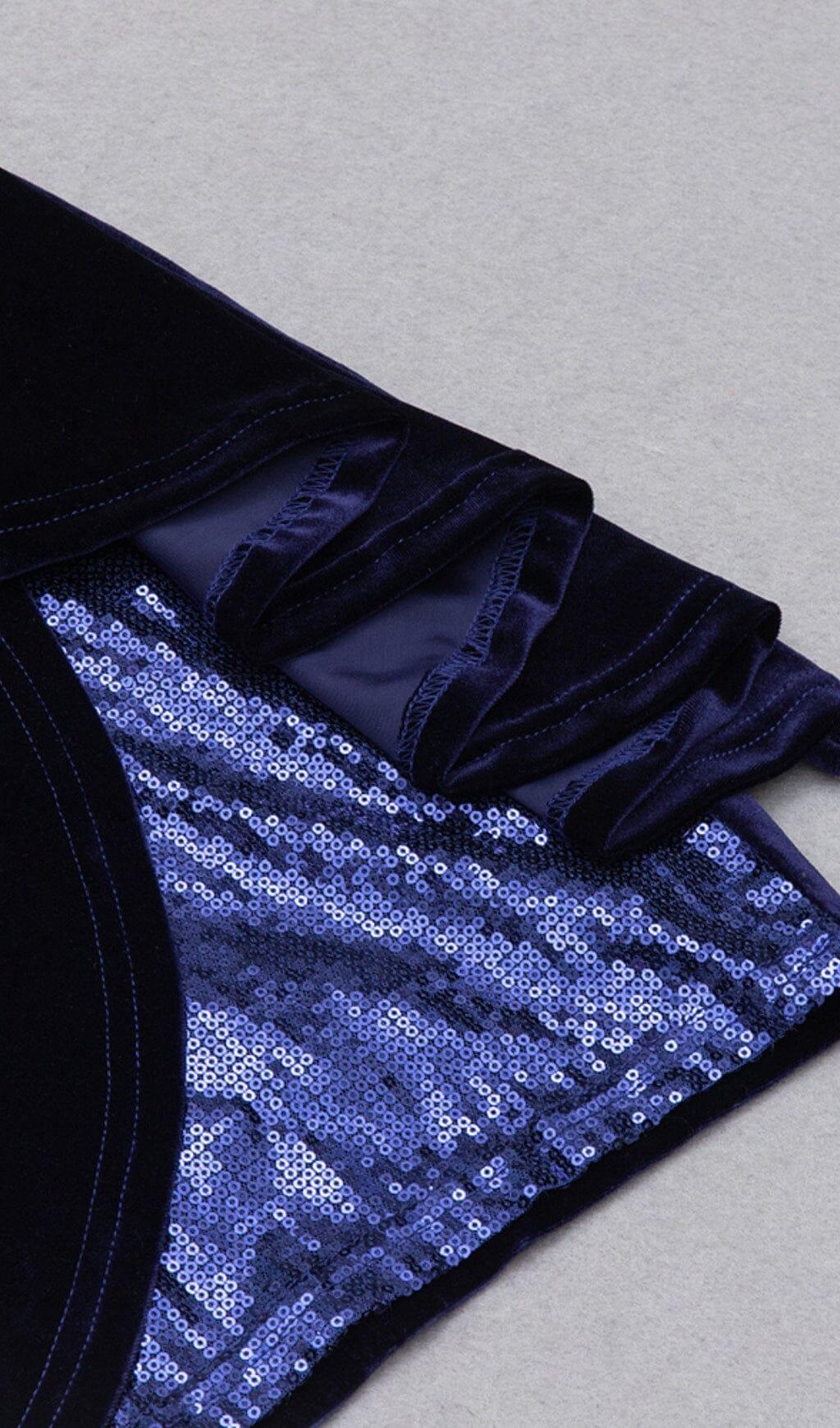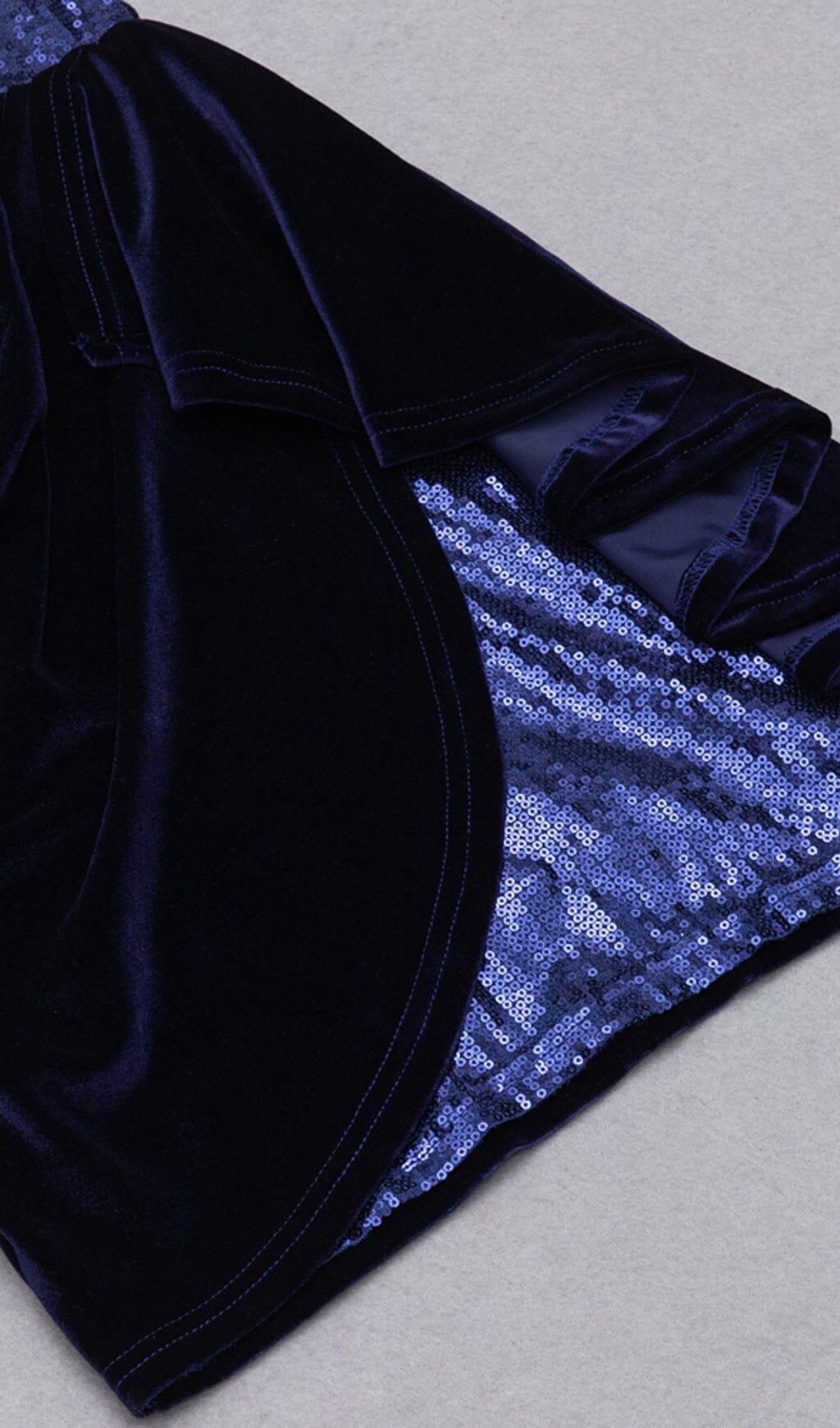 VELVET PLEATED SEQUINED MINI DRESS IN NAVY BLUE