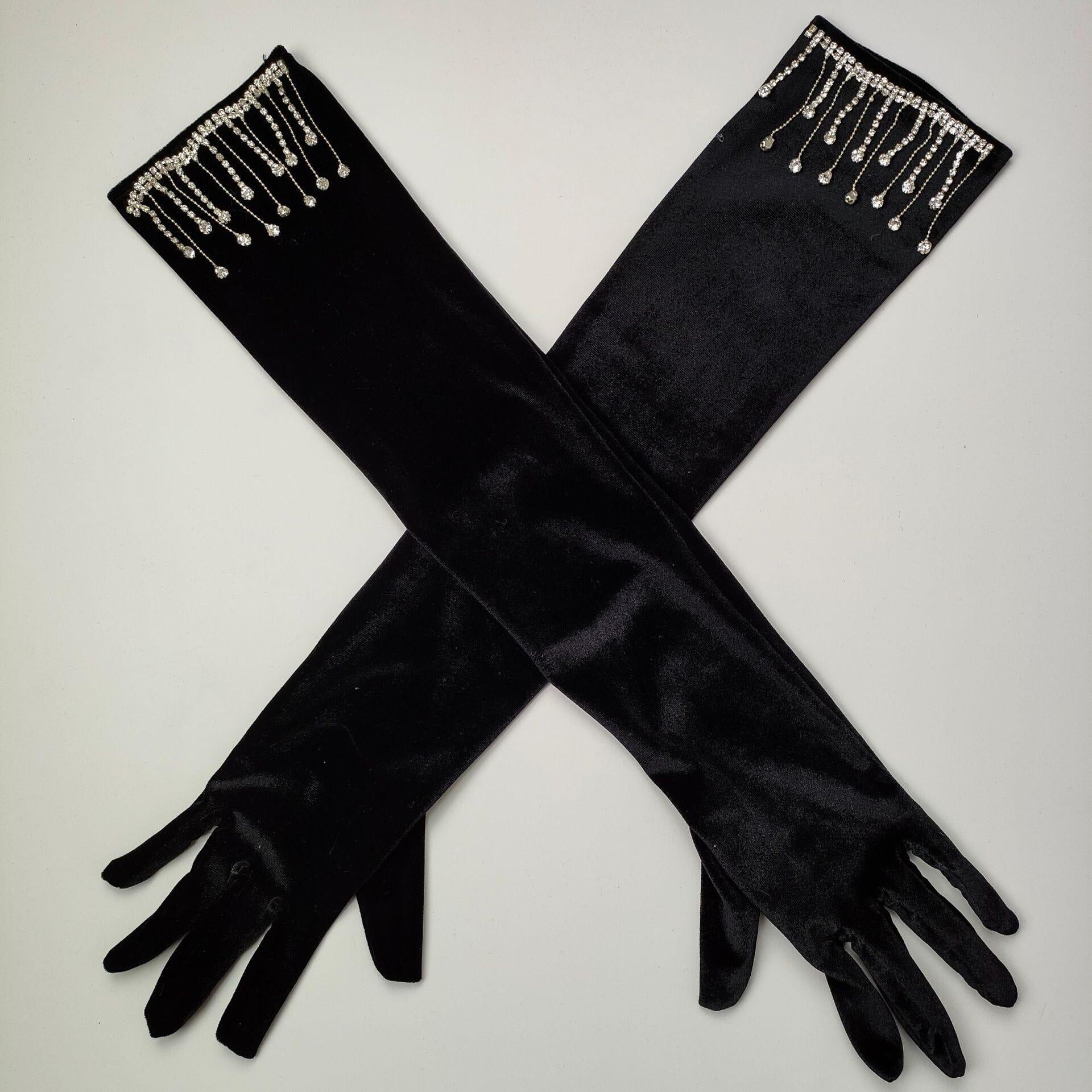 These stylish velvet rhinestone gloves will turn heads. Sleek and glittering with a fringed cuff, they'll make you the star of any show. Slip them on and shine on!
