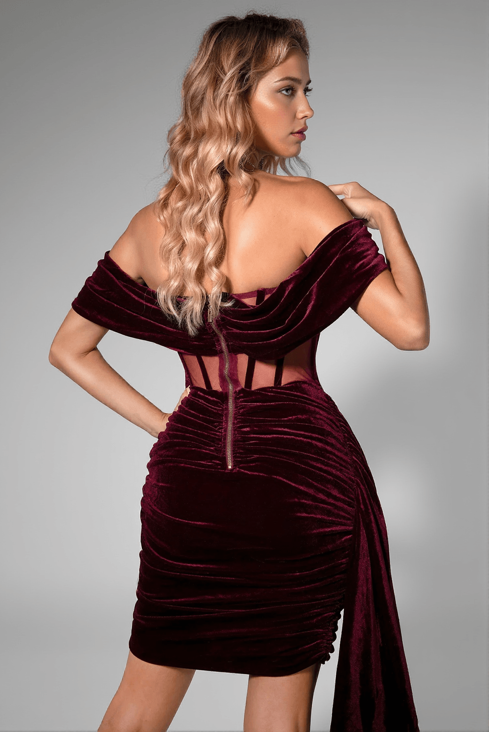 Dive into elegance with the Brinya Velvet Ruche Red Mini Dress, a captivating piece designed to make a bold statement at your next cocktail party or high-end event. This off-shoulder dress combines sophistication and allure in every detail.