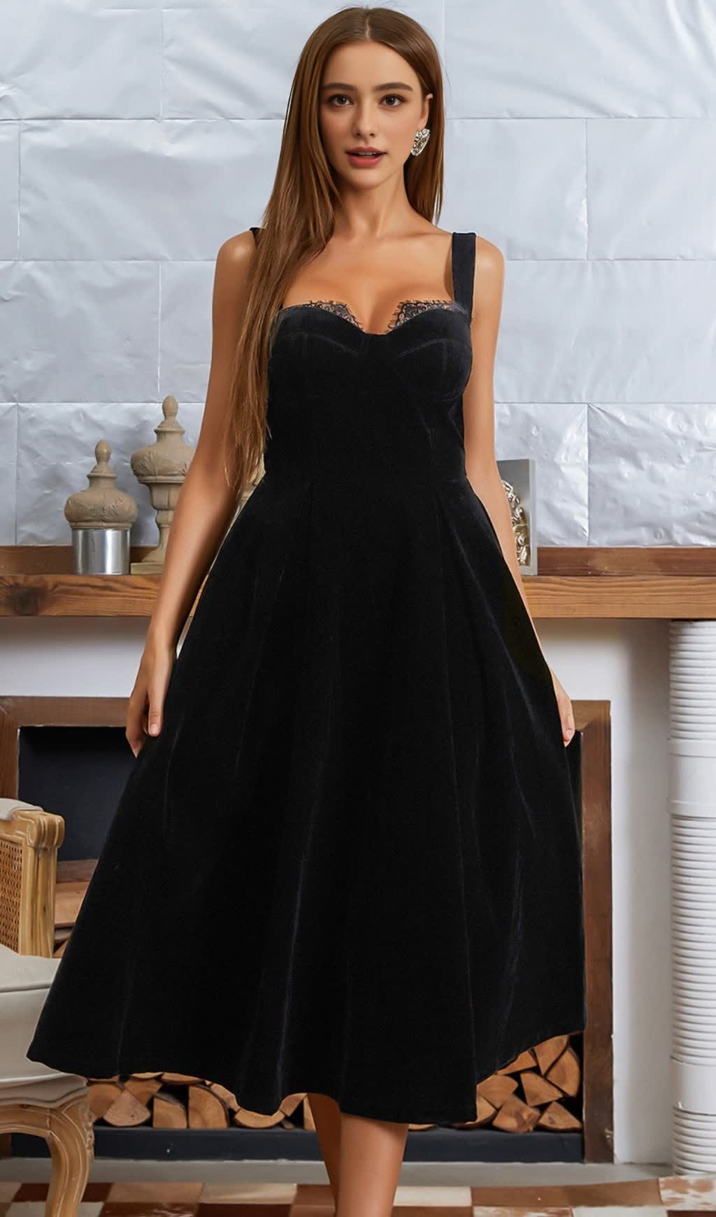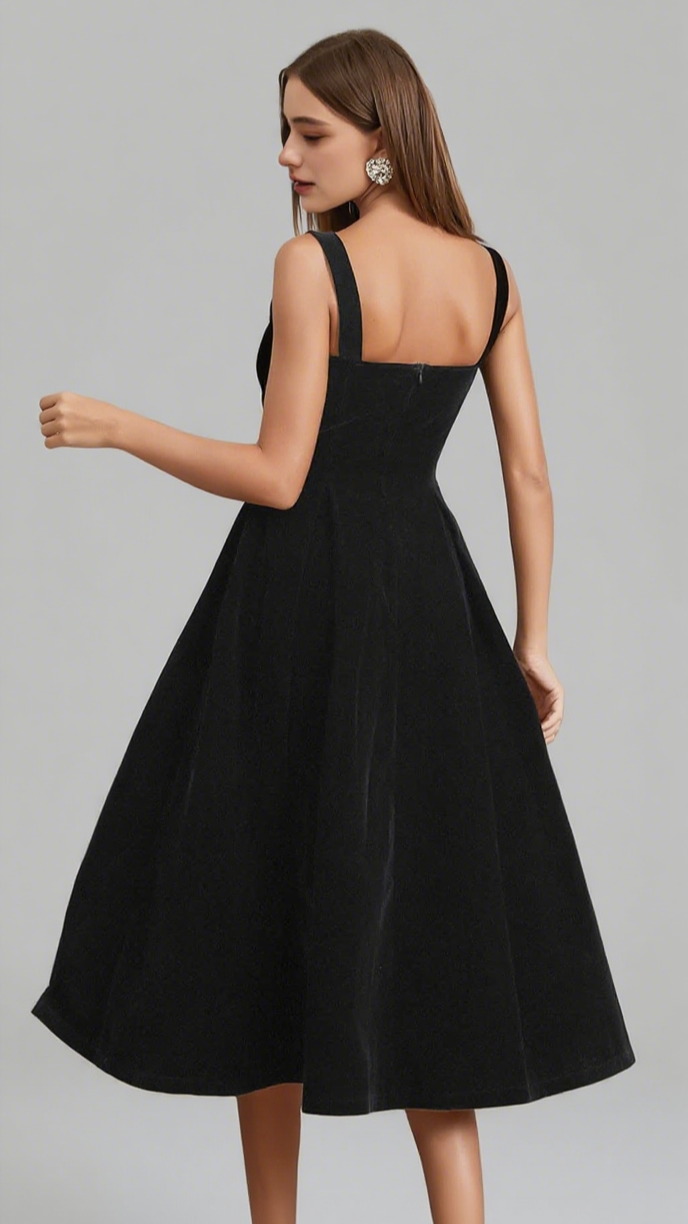 This dress is crafted from black velvet, featuring a square neckline and a flowing midi silhouette. The elegant, timeless design exudes sophistication. Ideal for ��holiday break dress to impress�� gatherings, as ��hoco dress inspo�� for homecoming, or a ��gothic romance outfit dress to impress�� event. Its classic, refined style lets you ��dress to impress�� confidently, perfect for formal dinners, parties, or special outings to stand out.