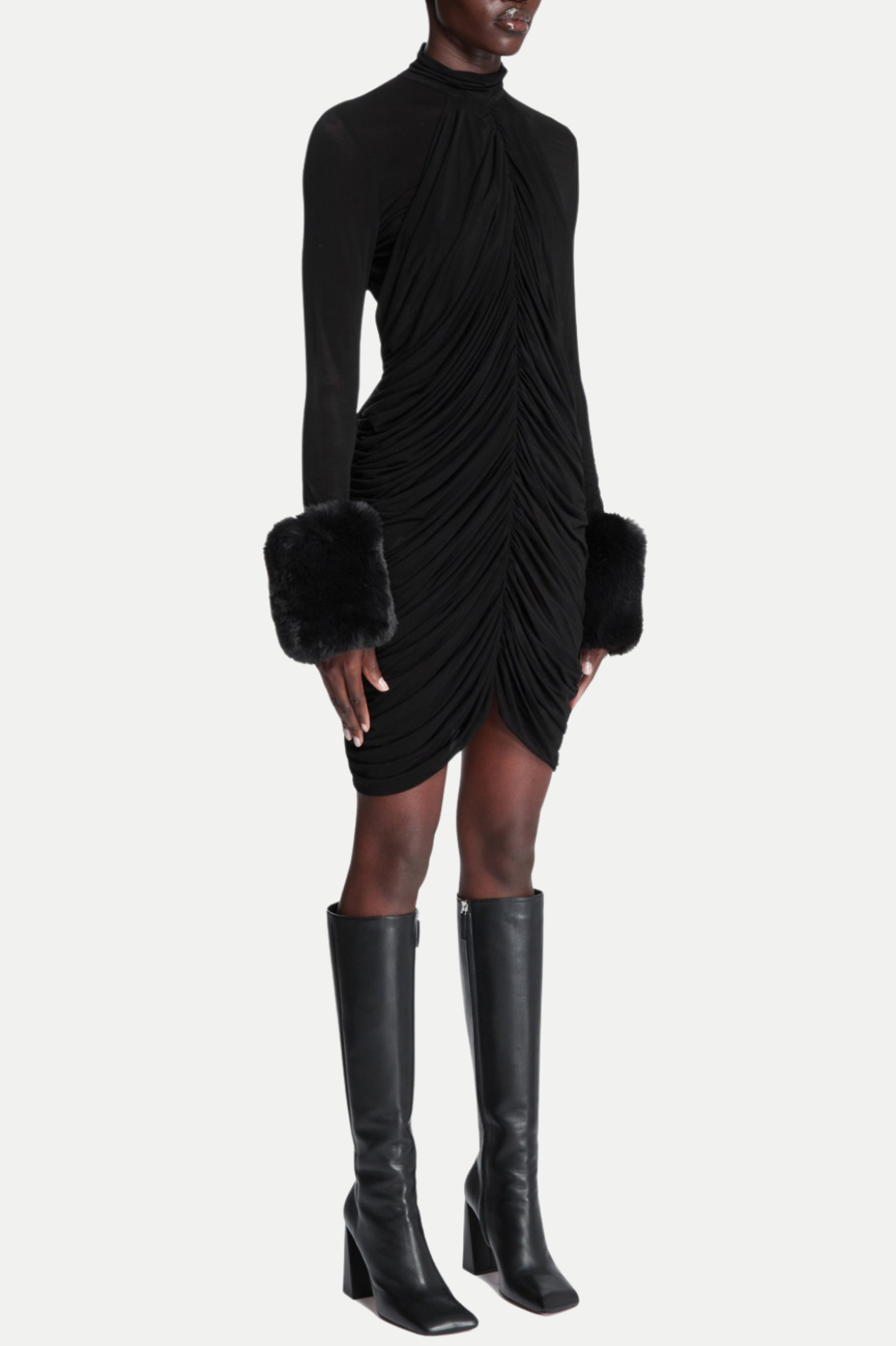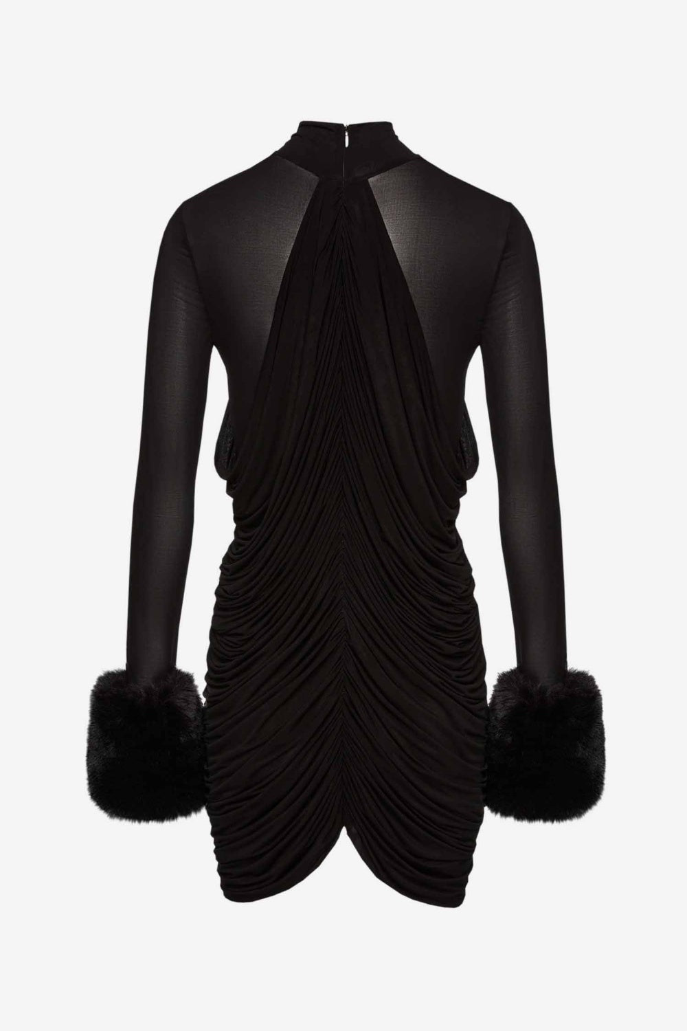 This sophisticated dress features ruched mesh detailing and faux fur accents, creating an elegant and exclusive look. The perfect choice for a night out, this dress is sure to turn heads and make you feel like a true fashion icon.