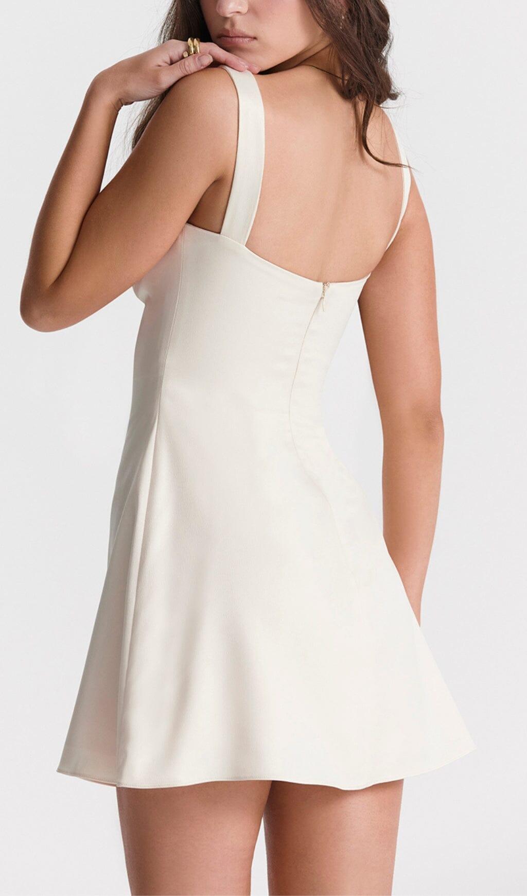 Experience true elegance and femininity with our Vintage Cream Mini Dress. Crafted from lustrous, ultra-light Duchess satin, this dress drapes effortlessly over your curves, creating a romantic and floaty silhouette. The prettiest cream hue adds a touch of sophistication, making this dress perfect for any occasion.