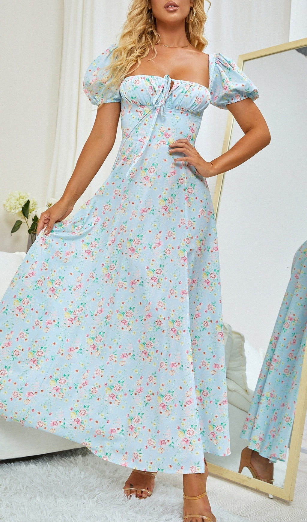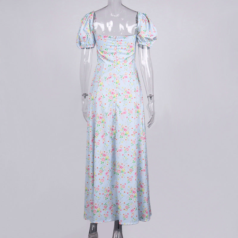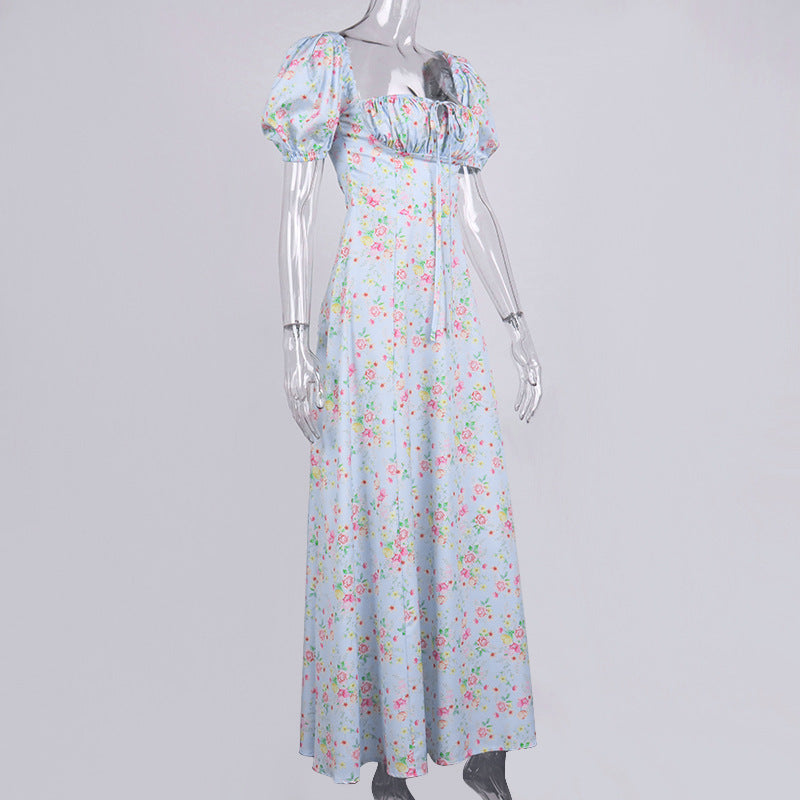 VINTAGE FLORAL PUFF SLEEVE MIDI DRESS IN BLUE