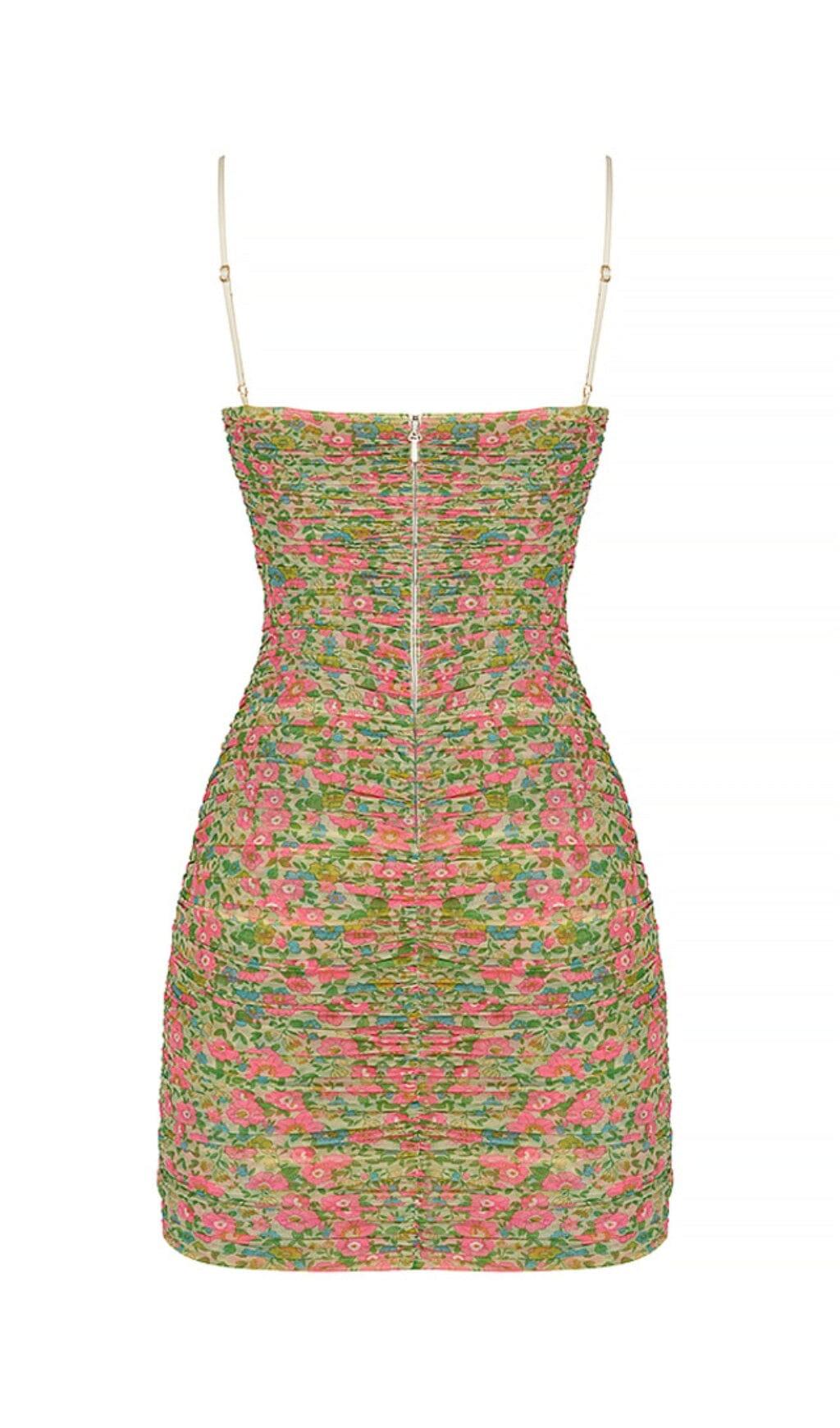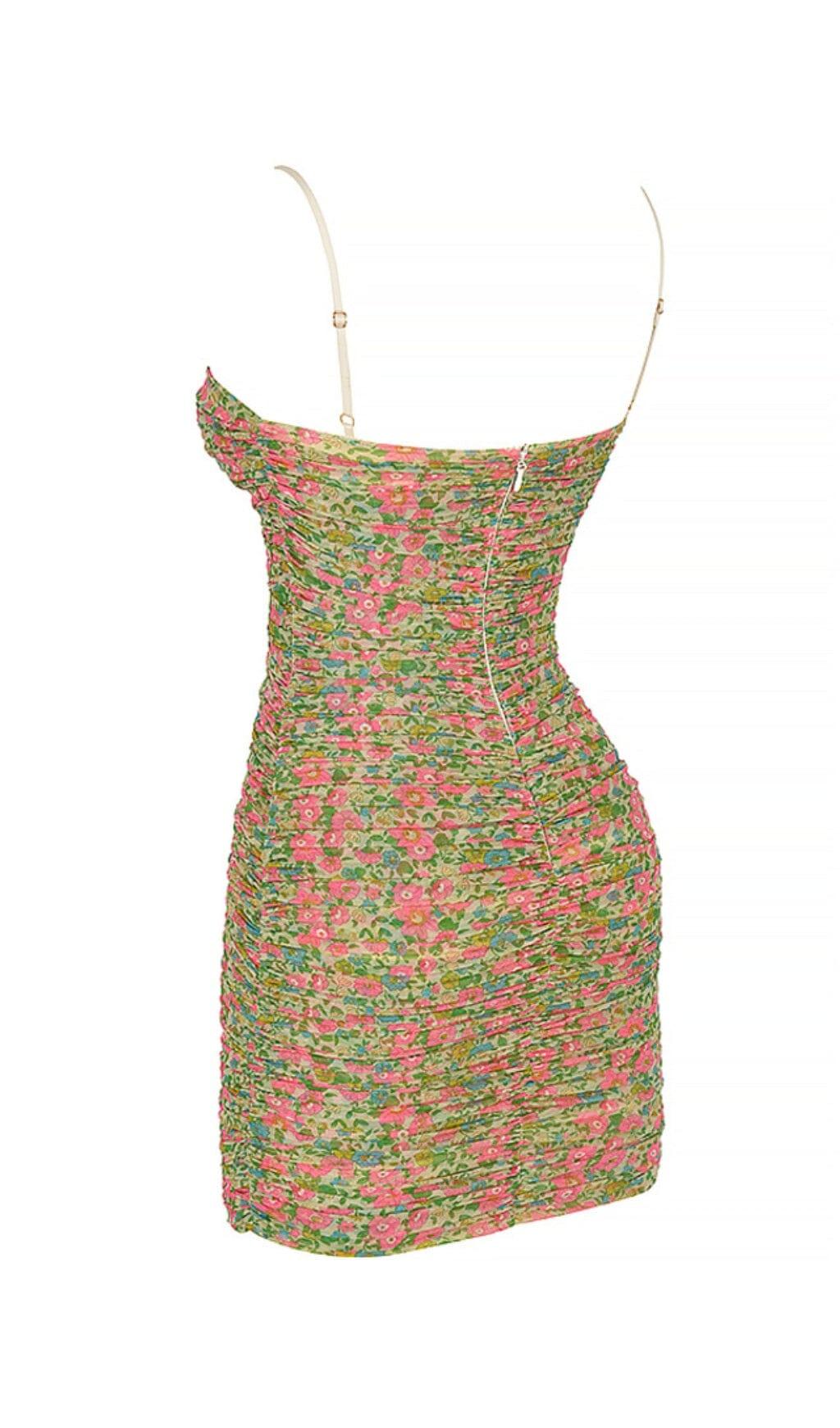 VINTAGE FLORAL RUCHED ORGANZA MESH MINI DRESS