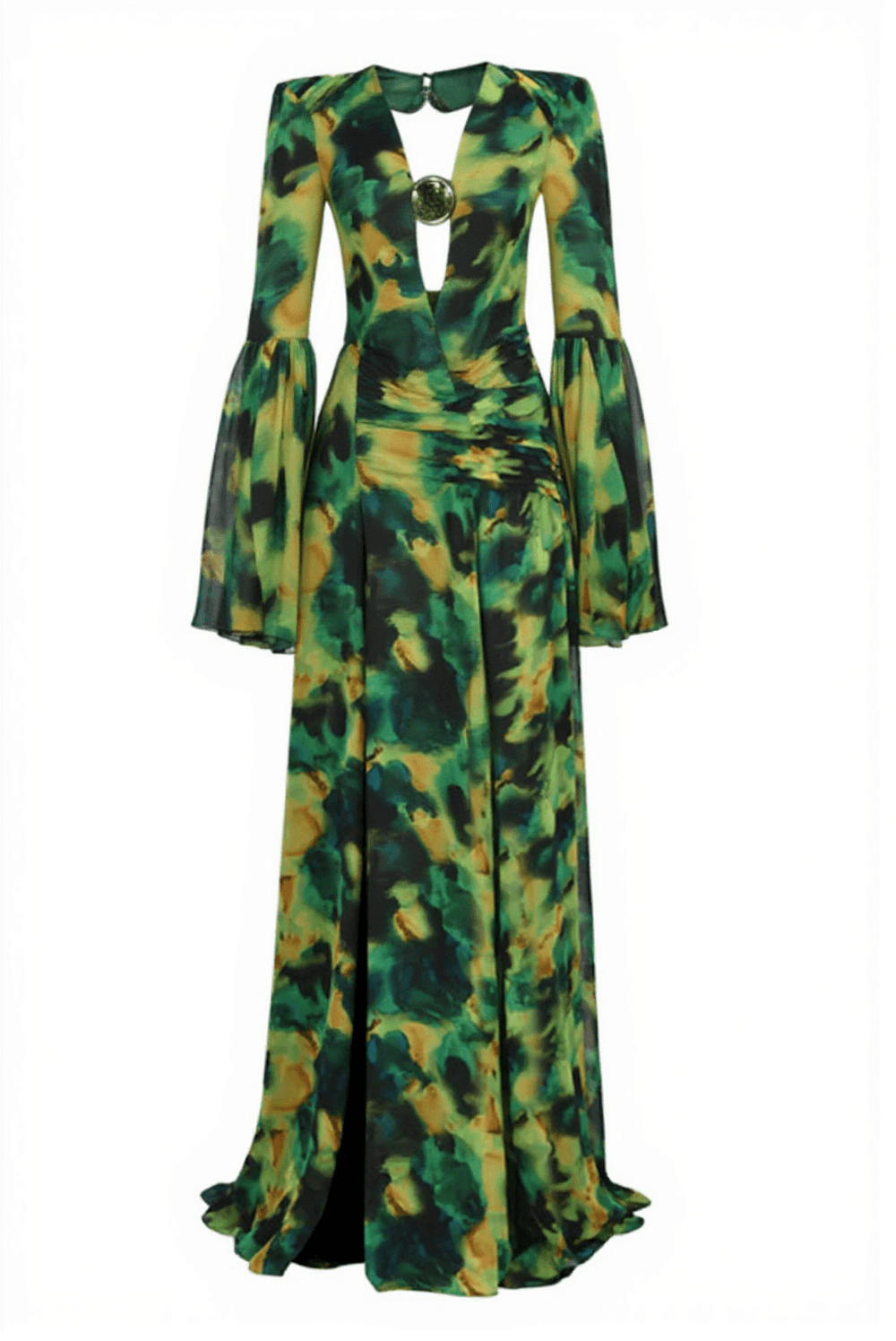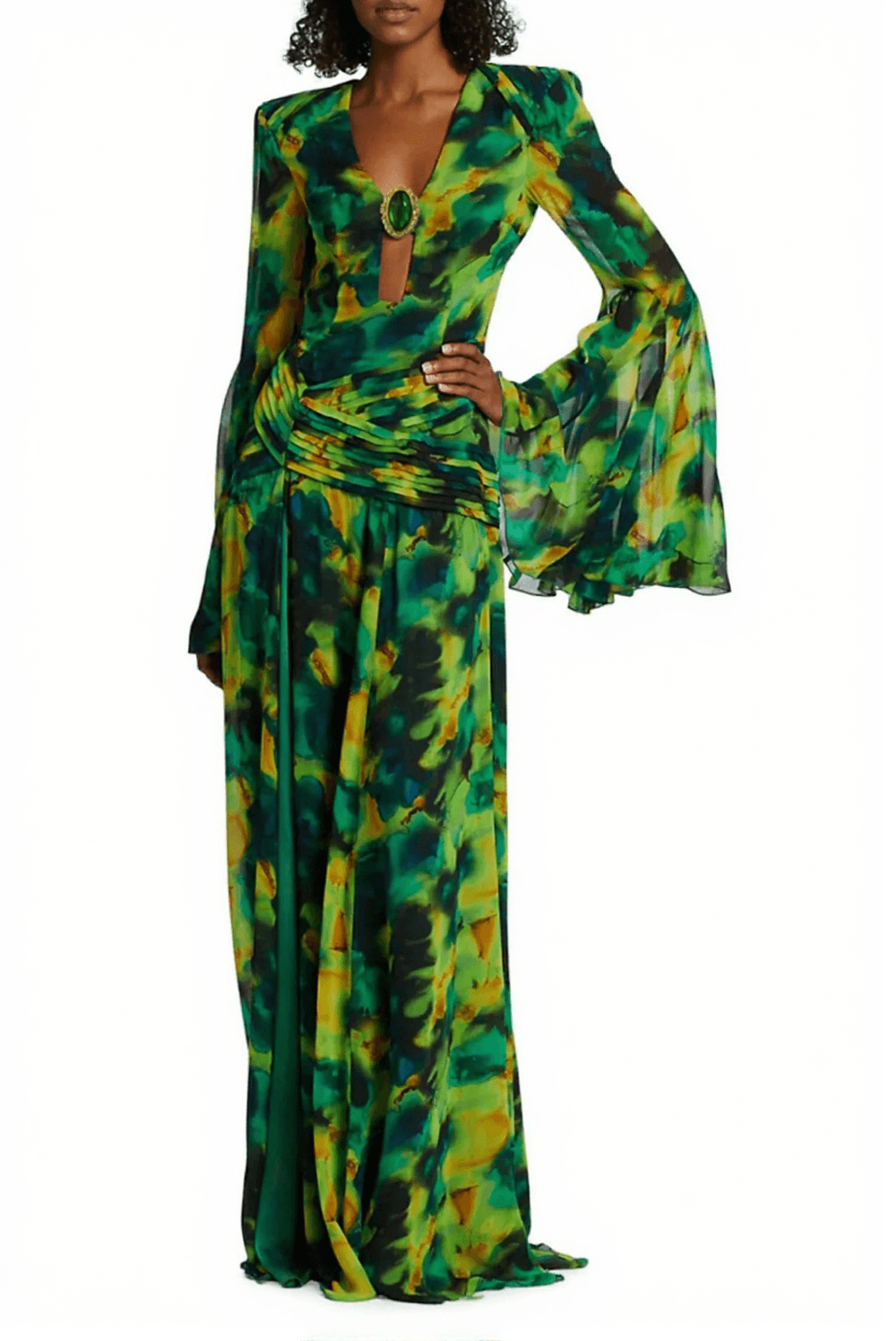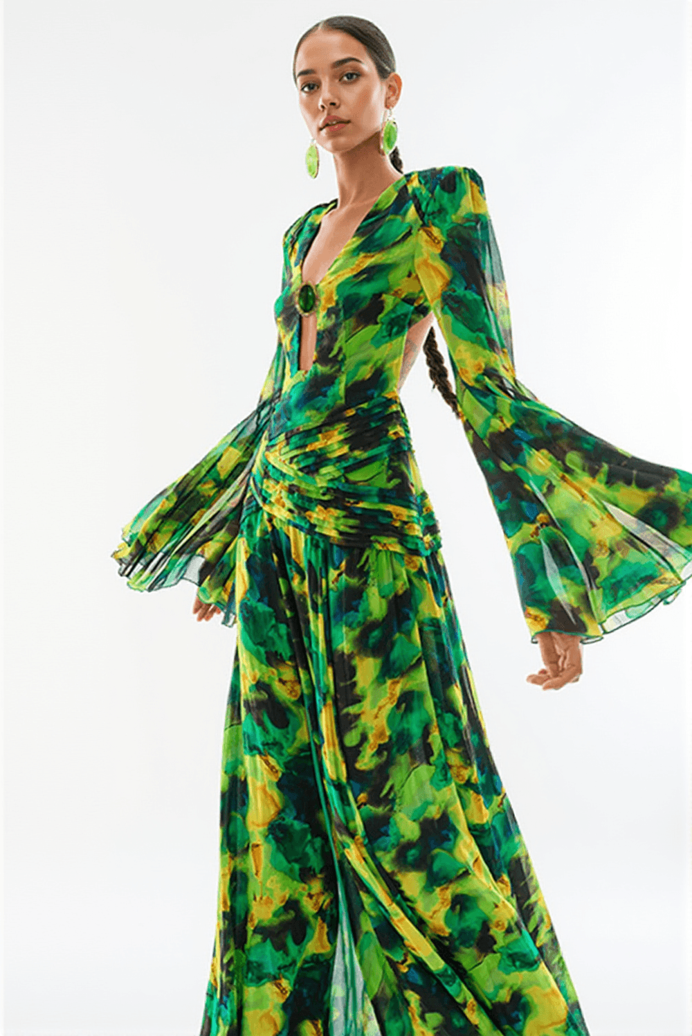 The flared sleeves and open back design add an element of mystery and allure, making this dress the centerpiece of any event. The lush chiffon material drapes beautifully over the body, enhancing your natural silhouette while offering a touch of comfort.