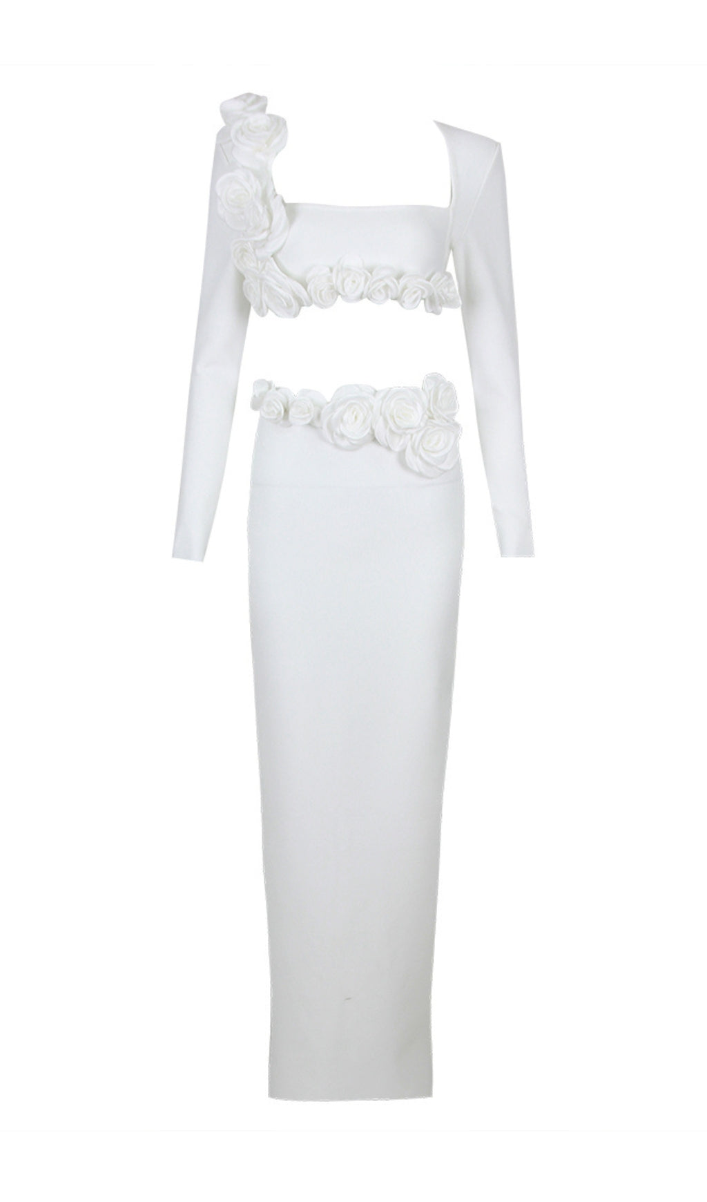 • Embellished Floral Details, Long Sleeves Crop Top, Long Straight Skirt.