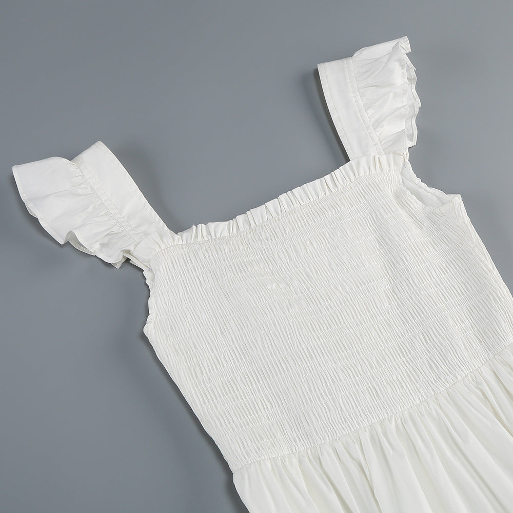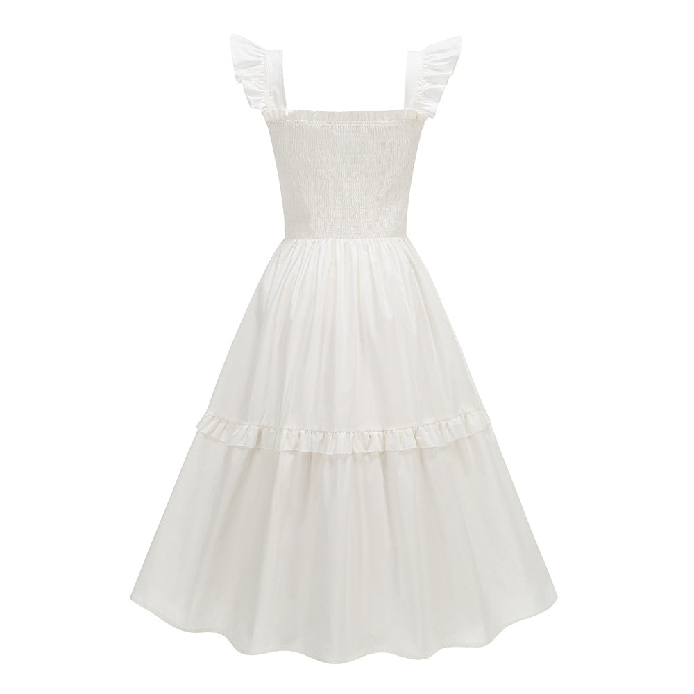 This dress showcases a white base adorned with delicate floral prints, ruffled square neckline, and tiered midi skirt. The smocked bodice ensures a flattering fit. Ideal for ��holiday break dress to impress�� outings, as ��hoco dress inspo�� for homecoming, or a ��beach pictures dress�� moment. Its bohemian - inspired charm and feminine details let you ��dress to impress�� with a whimsical, summery allure, perfect for garden parties, outdoor events, or casual gatherings where you want to stand out.