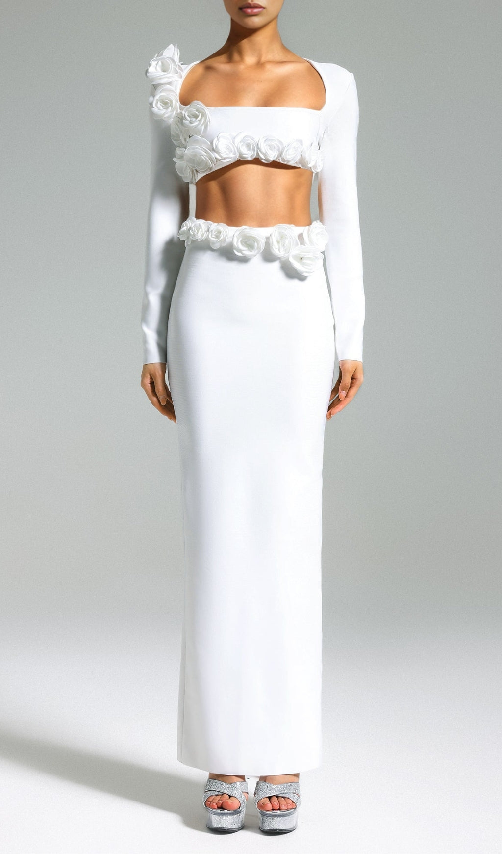 • Embellished Floral Details, Long Sleeves Crop Top, Long Straight Skirt.