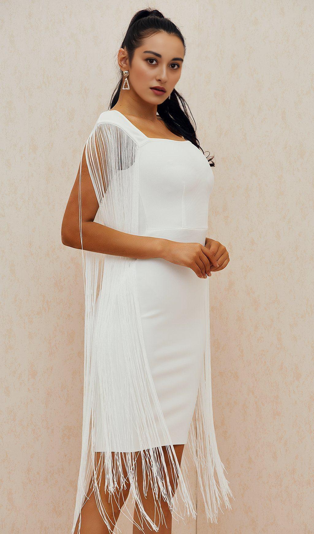 The White Fringed Bandage Dress is a must-have for any fashion-forward woman. Whether you're attending a cocktail party or a special dinner date, this dress is sure to make a statement.