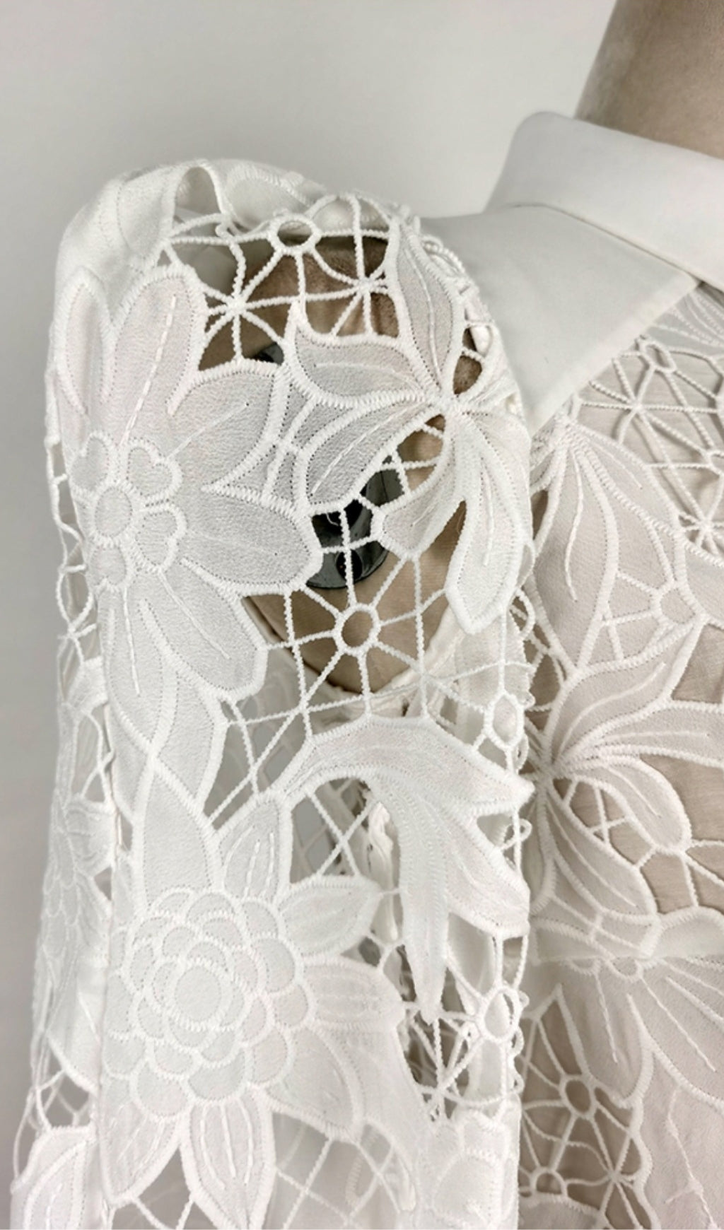 This stunning midi dress will make a statement for any occasion. Made from exquisite white lace, it's detailed with intricate embroidery, and finished with a full hem. Perfect for a classic and timeless look.
