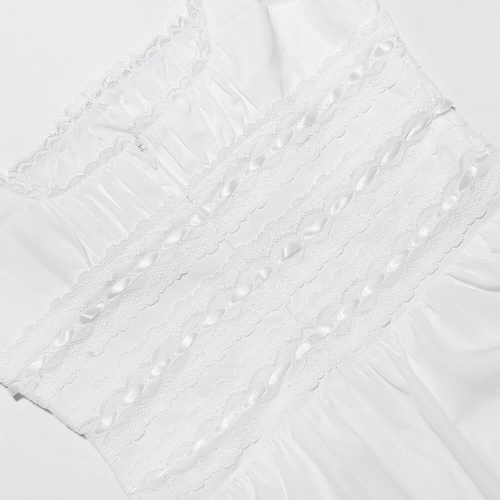 Our WHITE LACE TRIM MINI DRESS is the perfect garment for those carefree days on vacation. Made from stretch white cotton, this dress features beautiful lace panels that add a touch of elegance and reveal just a hint of skin. The close-fitting bodice is enhanced by a drawstring tie threaded through delicate lace trim, creating a feminine and flattering silhouette.