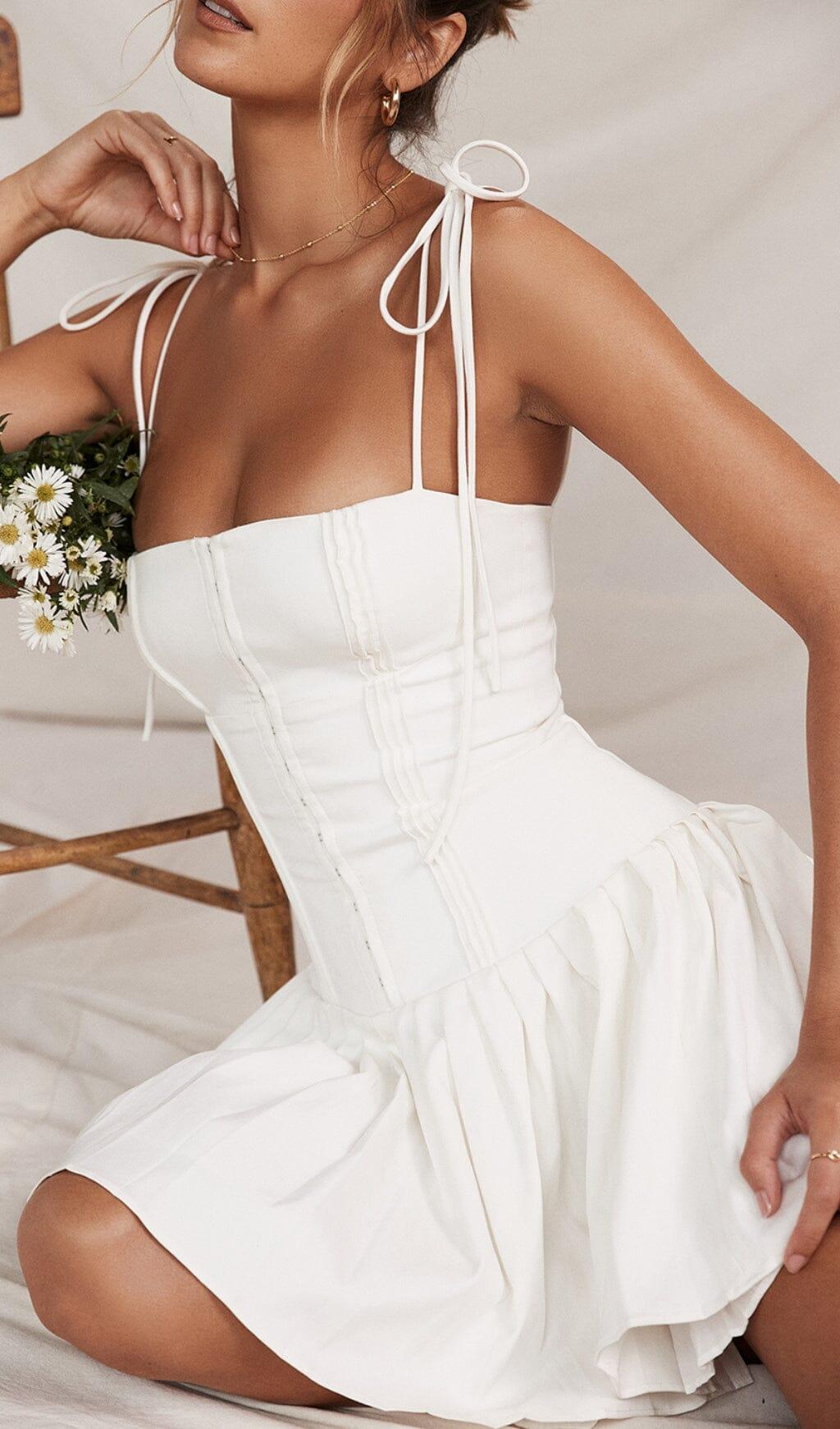 This white pleated mini dress is ultra feminine and the perfect dress for the Summer season. It has the prettiest details like the pin tuck bodice and hook and eye detailing to the front. The voluminous pleated skirt adds a touch of elegance and highlights great legs.