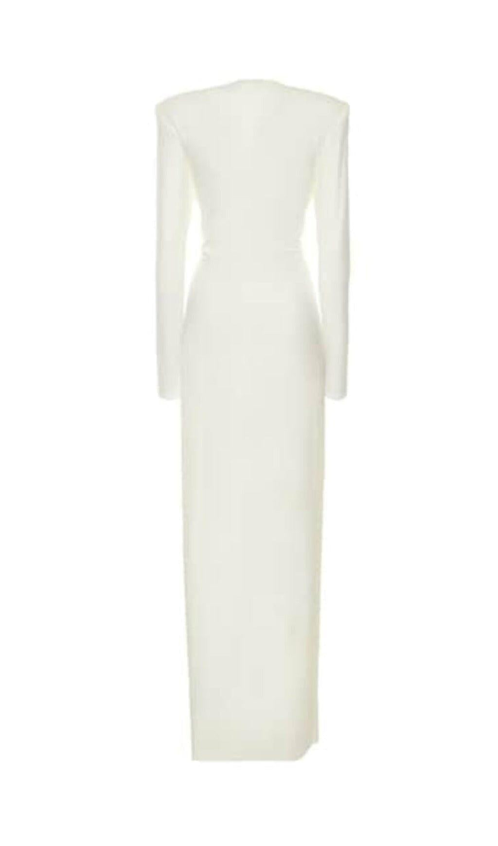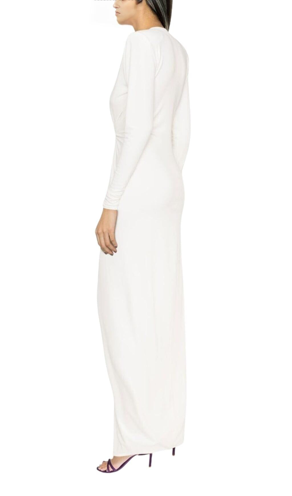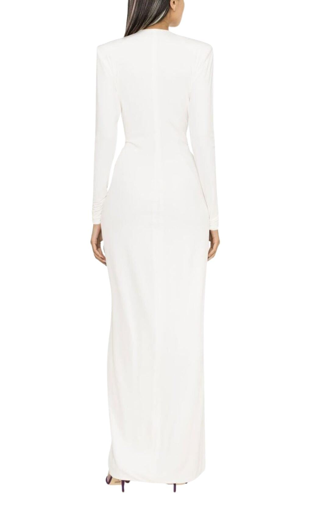 Dare to take risks with this bold white plunging-neck draped gown. Perfect for an adventurous night out, this striking gown will make heads turn and show off your daring side. Embrace the challenge with fashion-forward style!