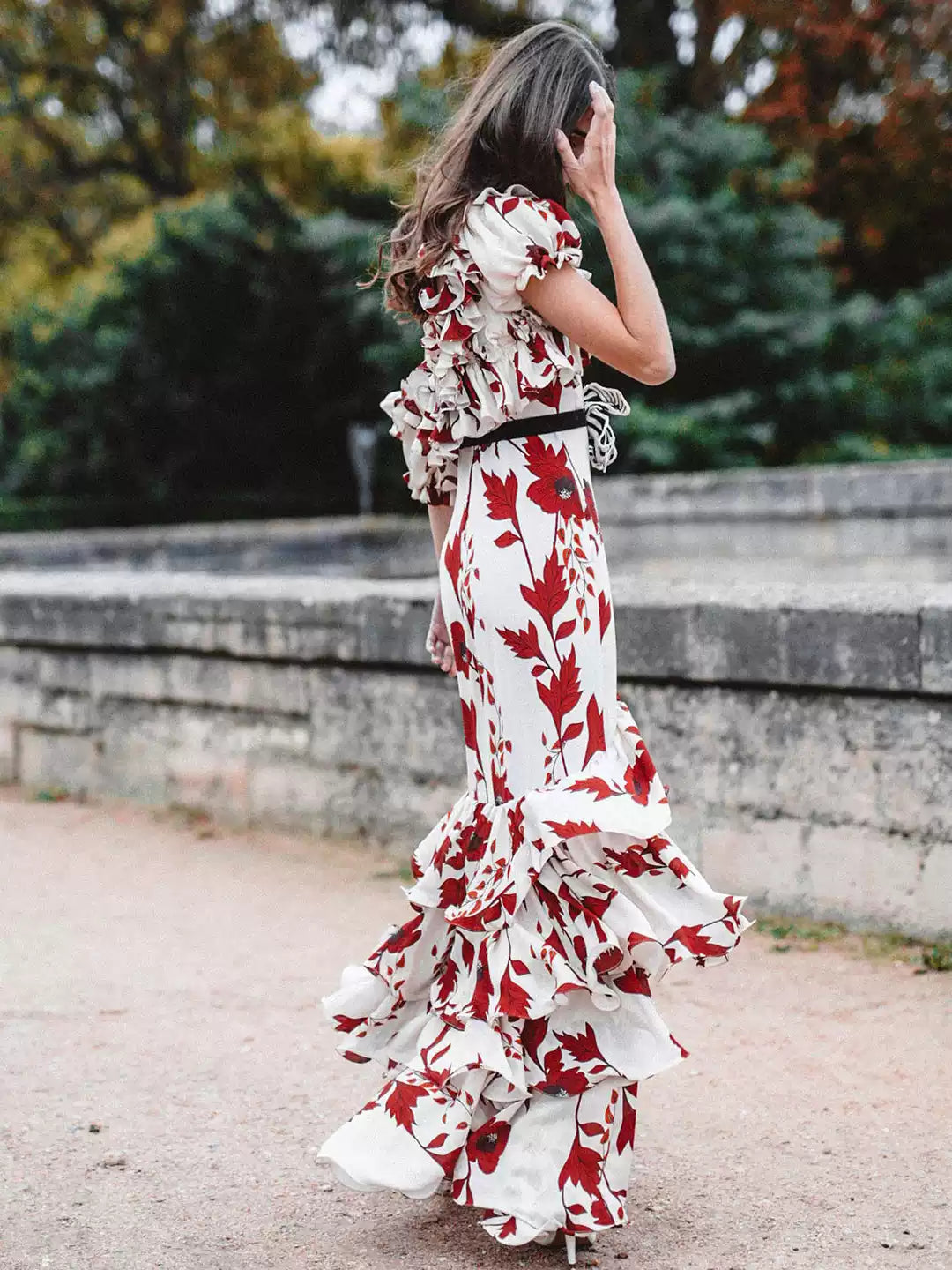 This dress features a white base with bold red floral prints, an off - shoulder design with ruffled detailing, and a tiered maxi skirt. The flowing silhouette and vibrant pattern create a romantic, eye - catching look. Perfect for ��holiday break dress to impress�� getaways, a ��beach pictures dress�� session, or as ��hoco dress inspo�� for homecoming. Its bohemian - inspired charm and dramatic details let you ��dress to impress�� with a feminine, whimsical allure, ideal for outdoor events, summer parties, or semi - formal gatherings where you want to stand out.