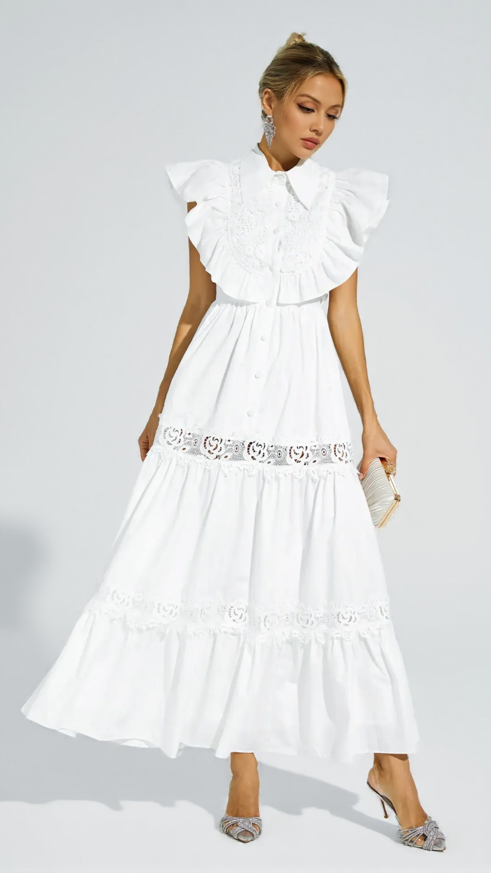 This white sleeveless midi dress features delicate ruffle trim detailing that adds understated elegance and movement. Its breathable fabric ensures comfort in warm weather, while the midi length provides a sophisticated silhouette suitable for both casual and semi-formal occasions. Designed for versatility, it pairs effortlessly with a variety of accessories, making it a timeless addition to your wardrobe.