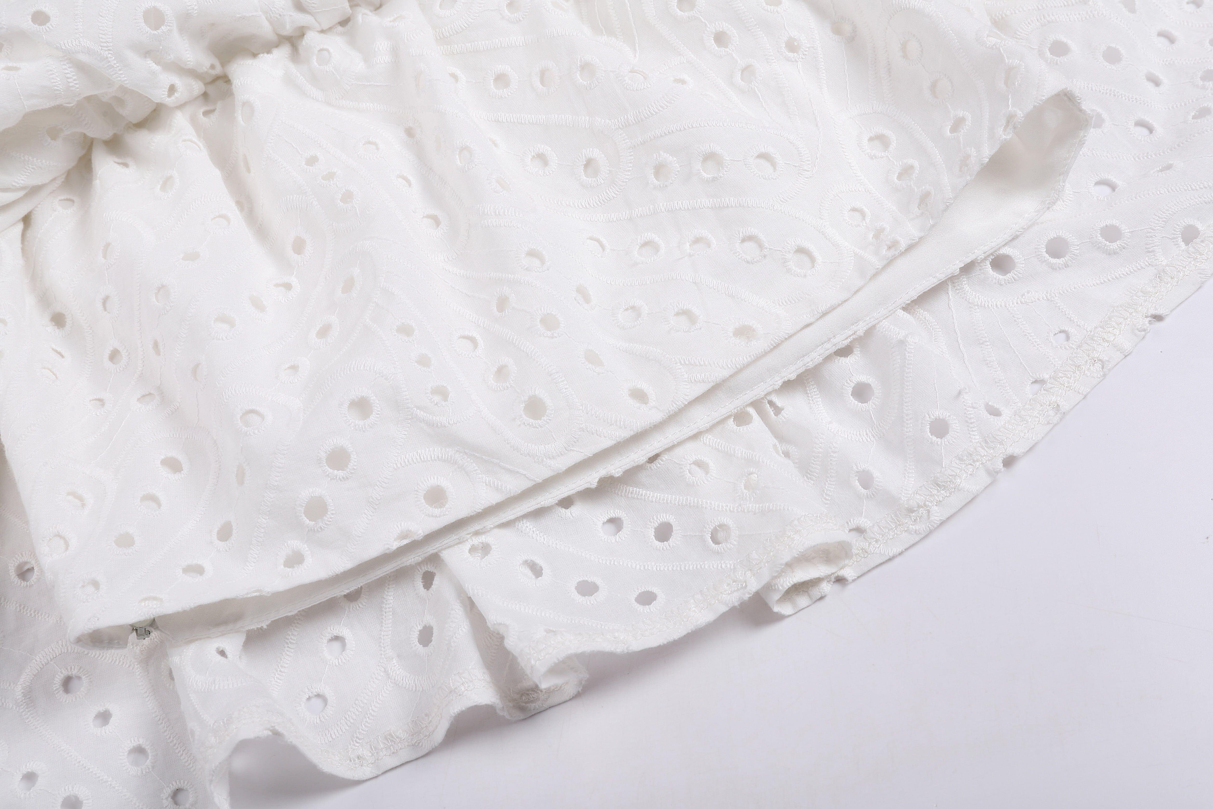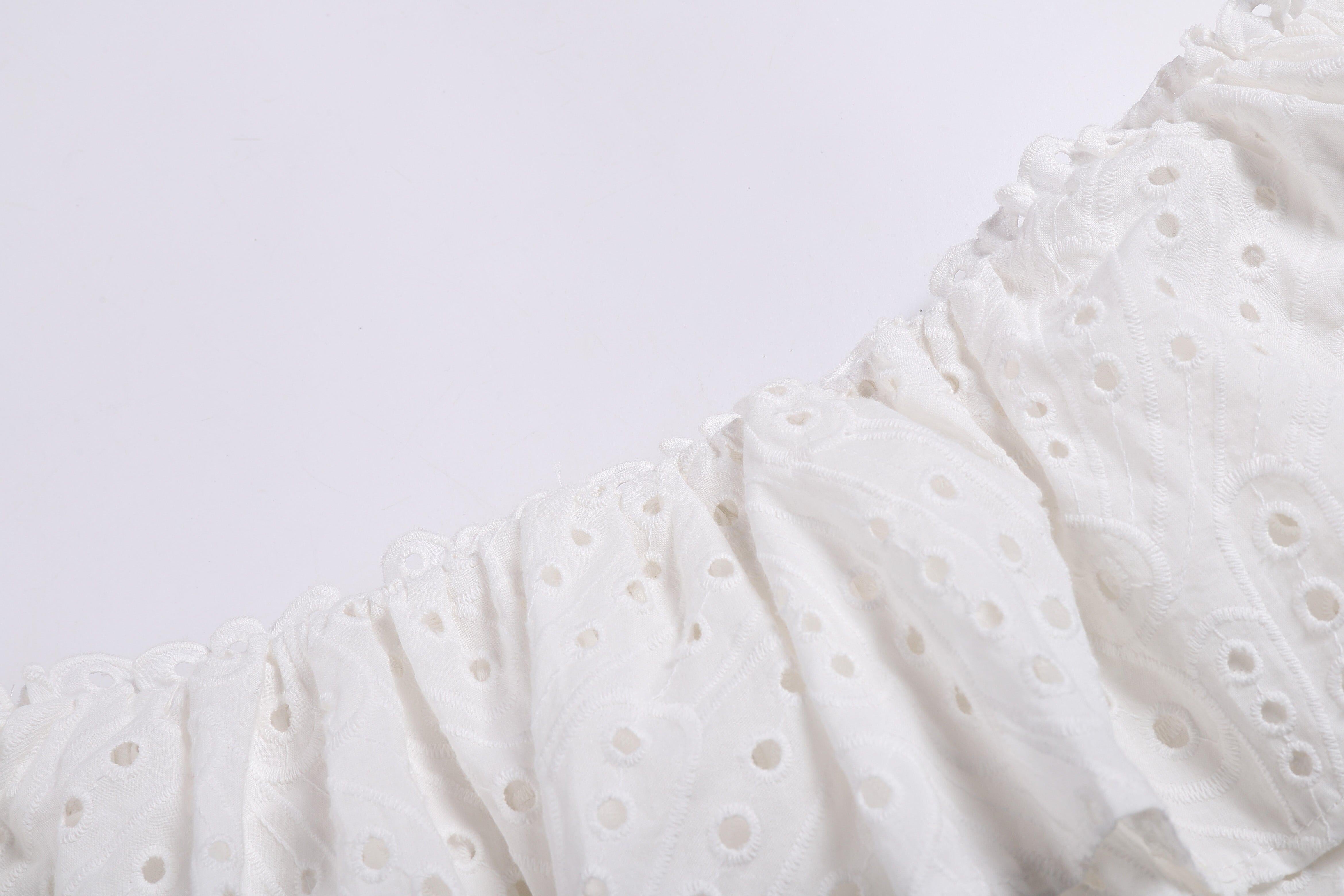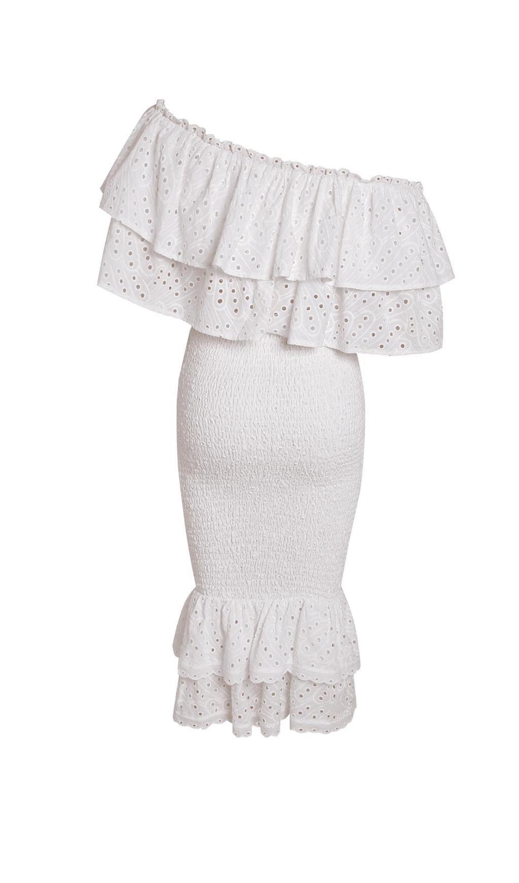 WHITE RUFFLES SKEW COLLAR TOPS & HIGH WAIST MIDI DRESS TWO PIECE SET