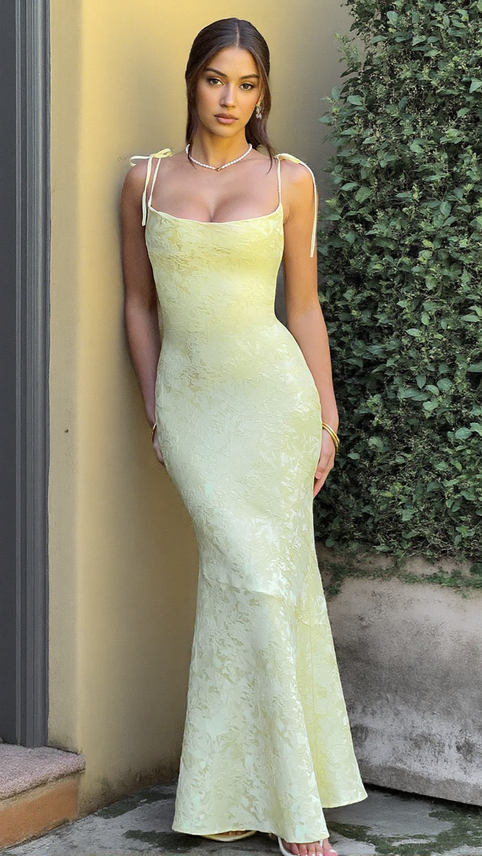 With pretty florals and a sexy, body hugging fit, Whitney exudes Romance. Made in our floral jacquard fabric with a bias cut to give a stunning drape to the skirt, the dress skims over your body for your most flattering fit yet. Complete with tie straps, lace up back and a sexy cowl neck, wear yours with sleek waves, a mini clutch and platform heels.