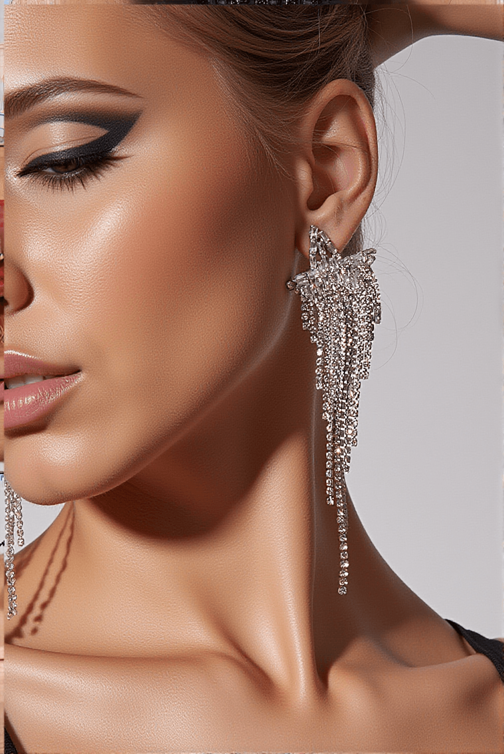 The Crystal Pentagram Tassel Long Earrings look stunning on the model, paired perfectly with a classic black gown to enhance her regal appearance.