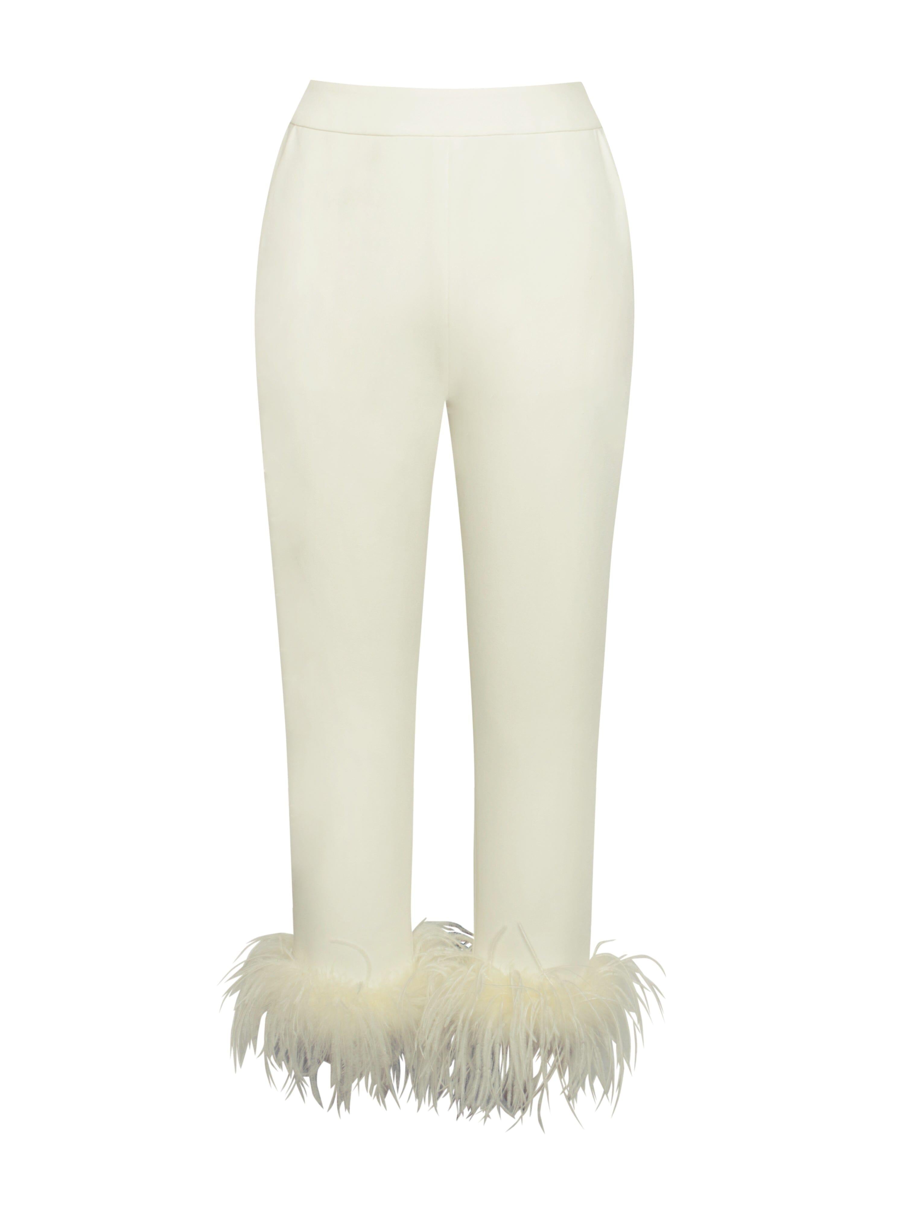 Don't settle for ordinary. Stand out from the crowd with our Cream White Blazer Suit with Feather Trim. Add a touch of luxury and sophistication to your wardrobe today!