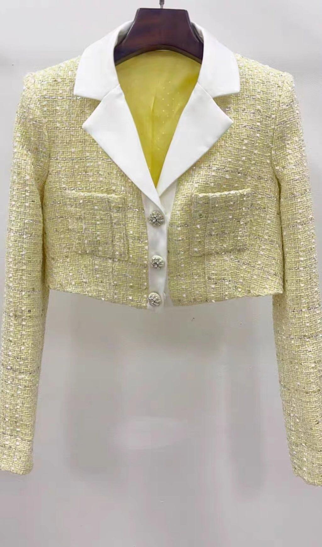 Light up your wardrobe with this yellow tweed short coat and skirt set! Crafted with lightweight and thin fabric, you'll look stylish and comfy all day long – and no one will be able to tell you otherwise!