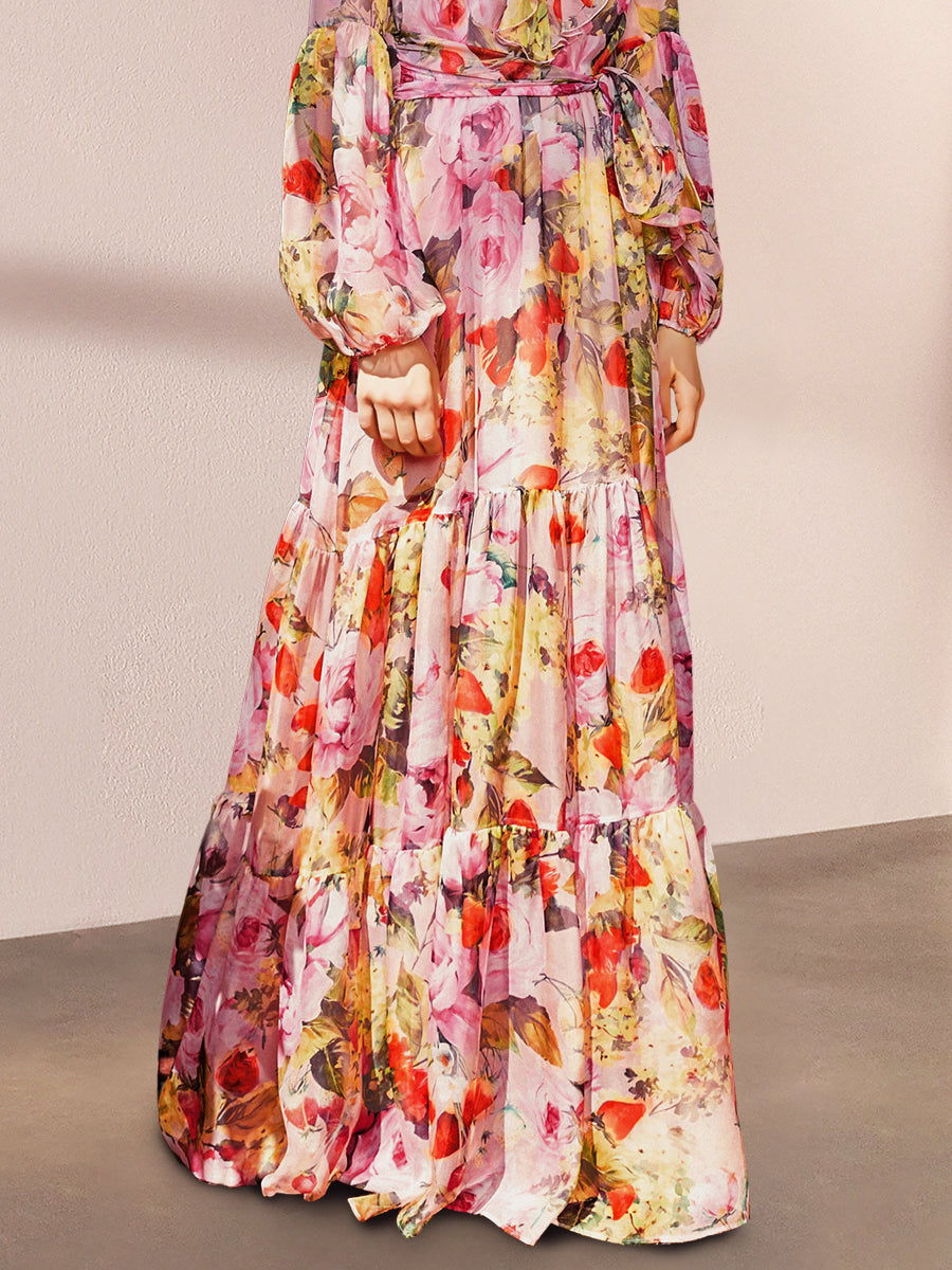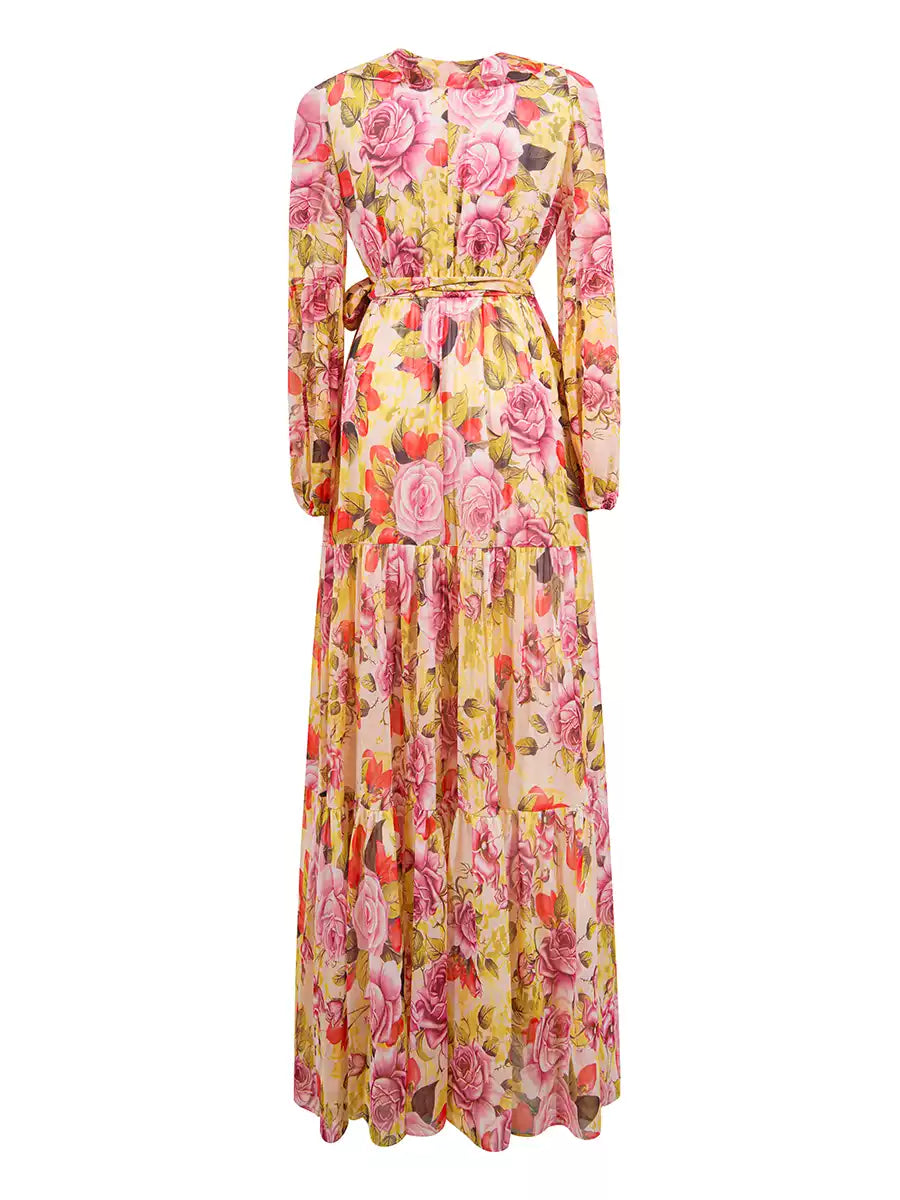 Yellow Floral Print Ruffle V - Neck Maxi Dress with Belt