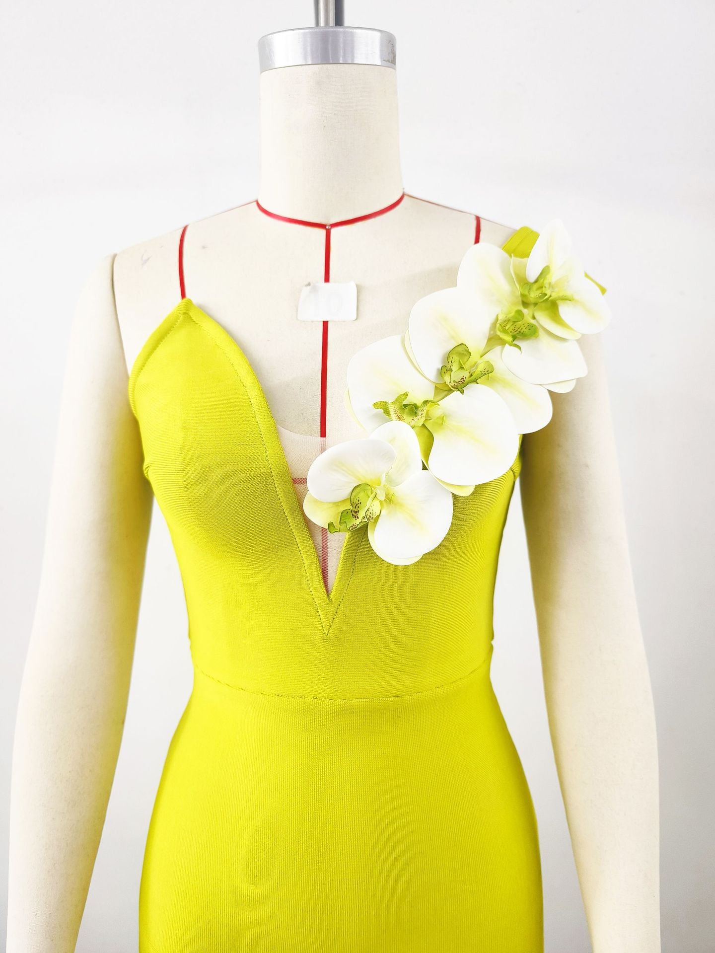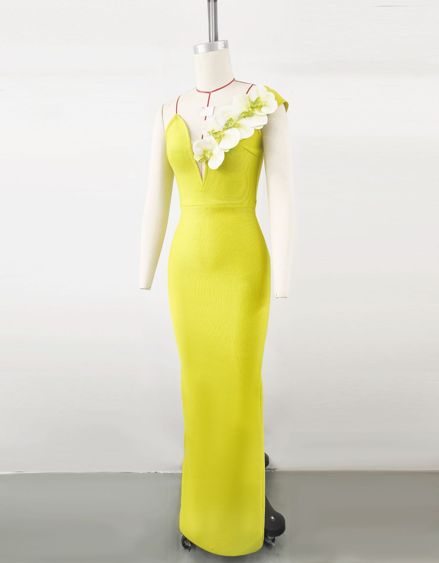 Design Style It belongs to the Bandage Dress category. Made of elastic fabric and featuring a body - hugging design, it can outline the body curves, showcasing a sexy and fashionable look. It is suitable for formal or fashion events such as dinners and parties. Detail Design Shoulders: It has a one - shoulder design. There are decorative white floral decorations on one side, adding a sense of romance and delicacy, breaking the monotony and highlighting the unique design. Neckline: A deep V - neckline enhances the sexiness and fashion sense, and shows the neck line. Color and Style: The eye - catching fluorescent yellow has a strong visual impact and catches people's eyes; The maxi style design adds an elegant aura and looks more flowing when walking. The overall look combines sexiness, elegance and personality. It is suitable for people who pursue a unique fashion expression and want to stand out in dressing. Whether attending a dinner, a fashion party or a high - end social event, it can show charm.