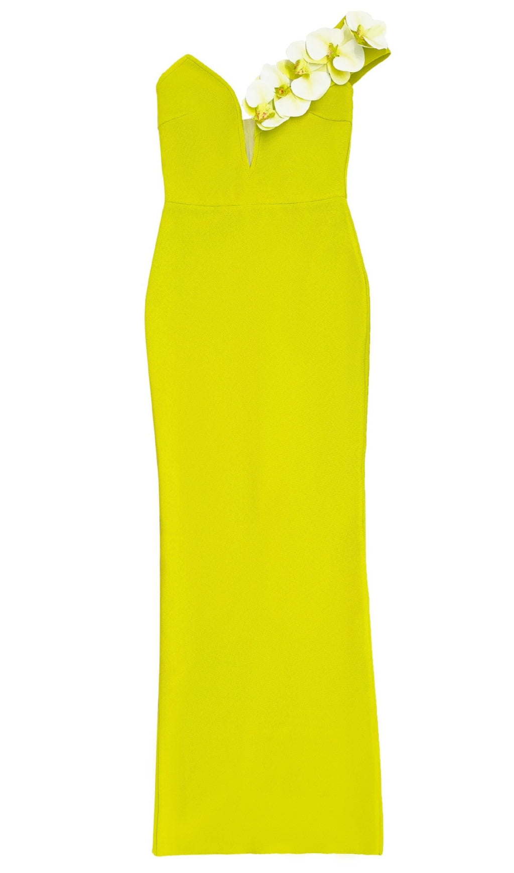 YELLOW-GREEN ONE-SHOULDER FLORAL BANDAGE SPLIT MAXI DRESS