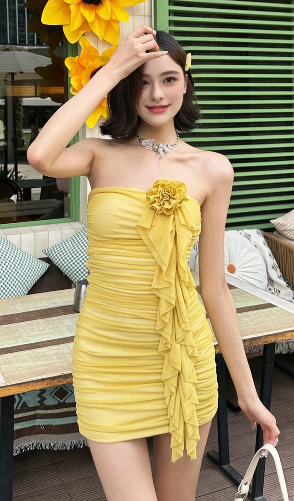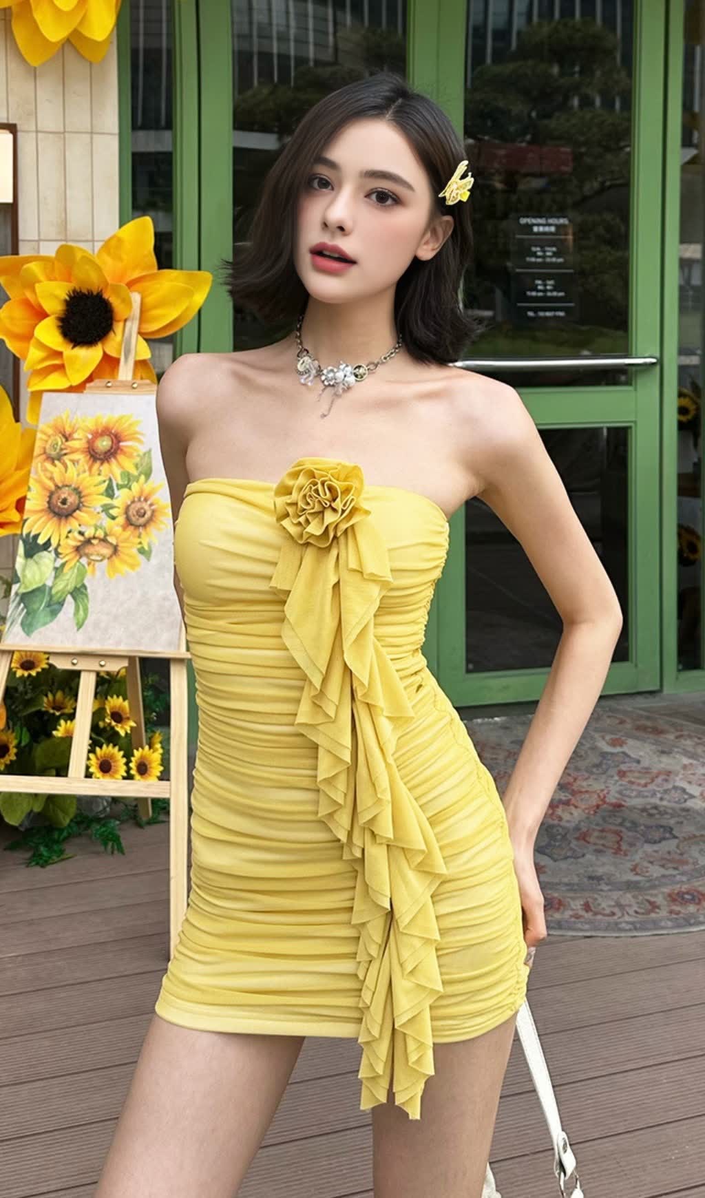 This dress is a bright yellow strapless style. It has a ruched design all over the body, which can show the curves well. There is a large flower decoration on the chest, matched with a layered ruffle hem, adding a sense of romance and playfulness. The fabric looks light and breathable, very suitable for summer wear.